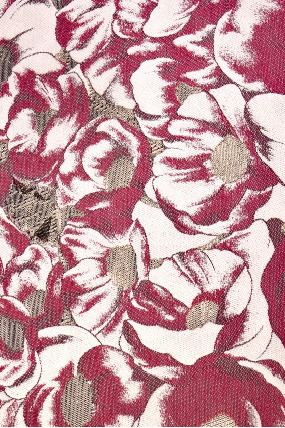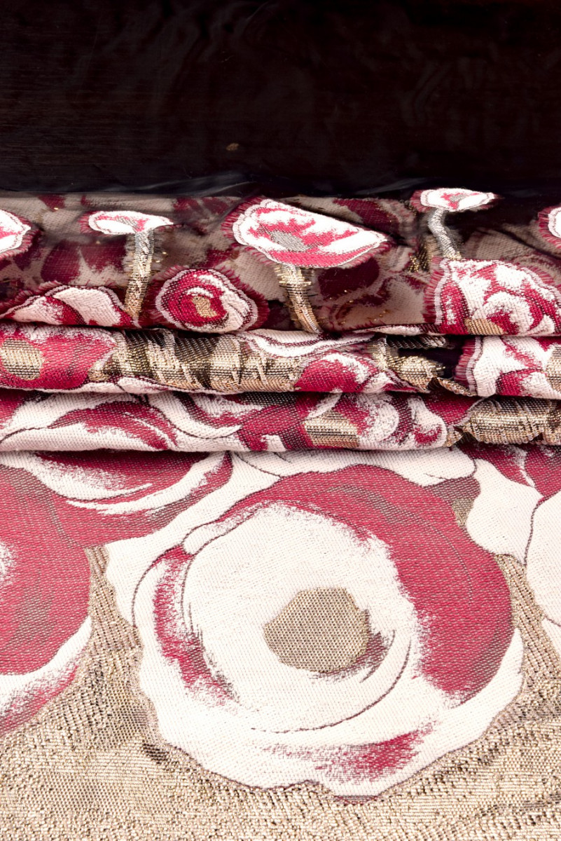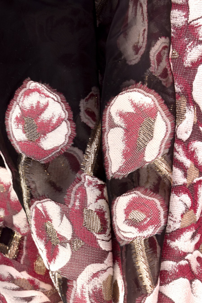 Žakardas su didelių augančių gėlių raštu rožinės, ekru ir aukso spalvos, audinio viršus pagamintas iš skaidrios juodos organzos. 140 cm * 90 cm ilgio kuponas.