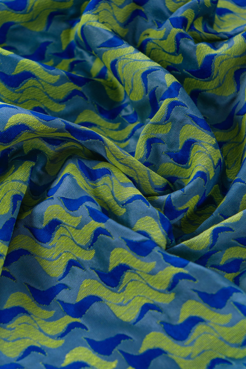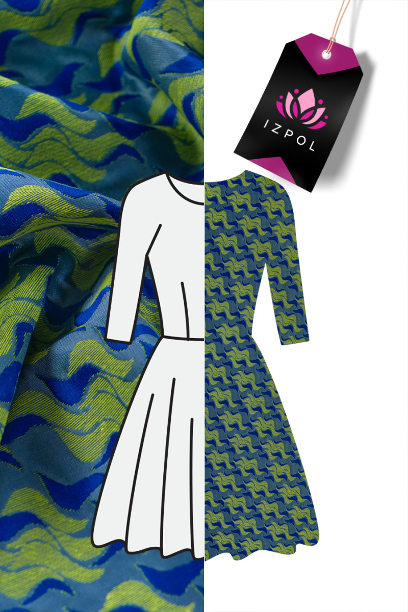 Itališkas žakardo kostiumo audinys su bangų motyvu rugiagėlių mėlyna ir kalkių žalia - jis gali būti siuvamas iš abiejų pusių. Audinys yra storesnis, standus, neelastingas. Puikiai tinka suknelės, kostiumo, sijono siuvimui ar dekoratyviniais tikslais.