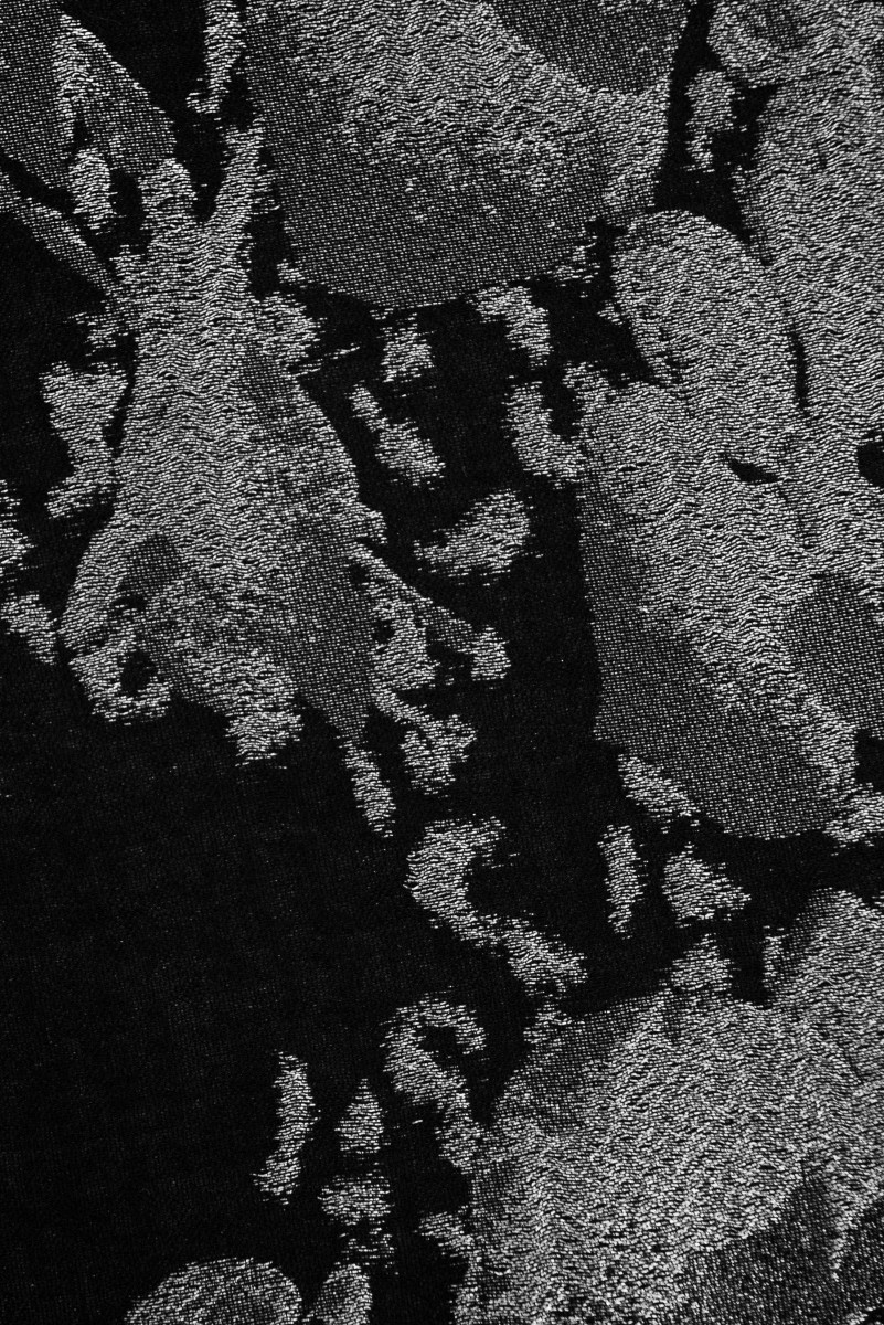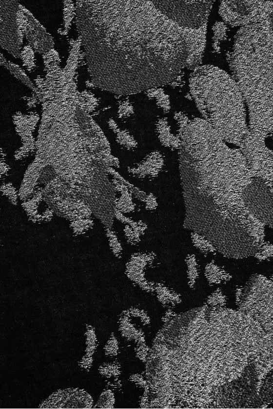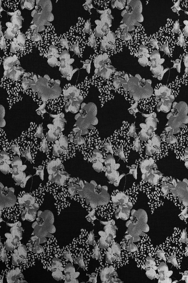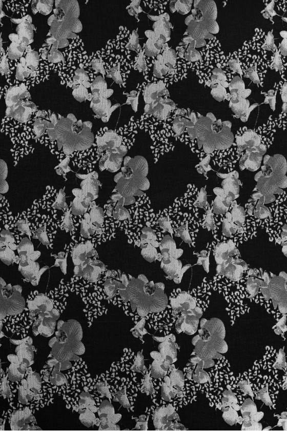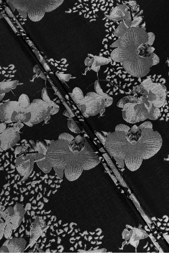 Itališkas žakardo audinys juodos spalvos su pilkų gėlių motyvu - natūralaus šilko ir poliesterio mišinys. Plonas, šiek tiek skaidrus, minkštas, neelastingas audinys su subtiliu blizgesiu, būdingu šilko audiniams - jis gali būti siuvamas iš abiejų pusių.