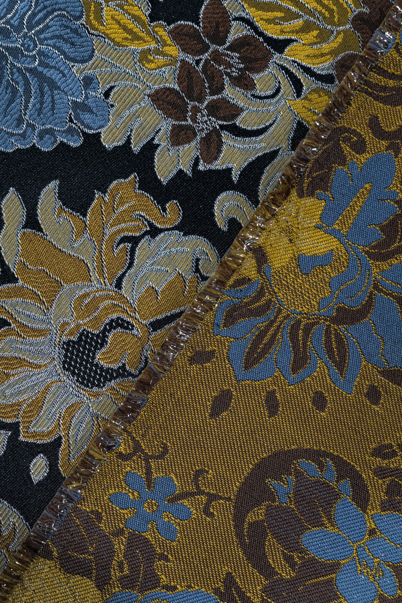 Itališkas žakardo kostiumo audinys juodos spalvos su gėlių motyvu rudos, garstyčių ir mėlynos spalvos. Audinys storesnis, standus, įdomiai dekoruotas sidabro lurekso siūlu.