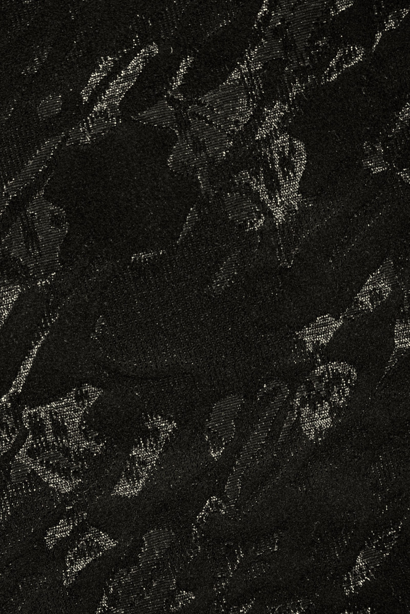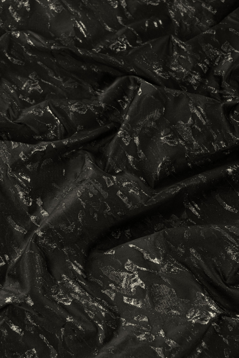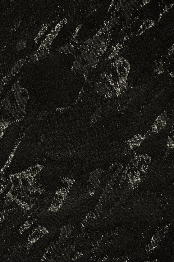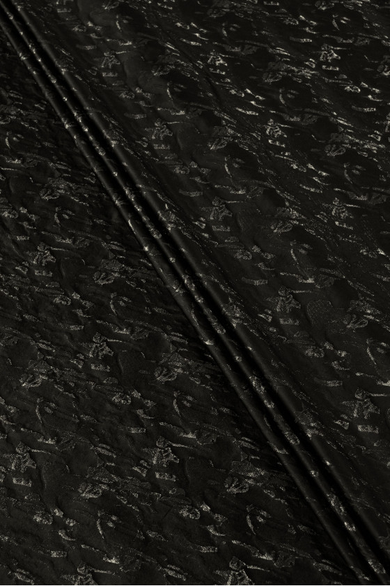Itališkas žakardo kostiumo audinys juodos spalvos su išgalvotu raštu, dekoruotu juodu ir auksiniu lurekso siūlu. Audinys yra plonesnis, standus, neelastingas, gražiai blizgus.