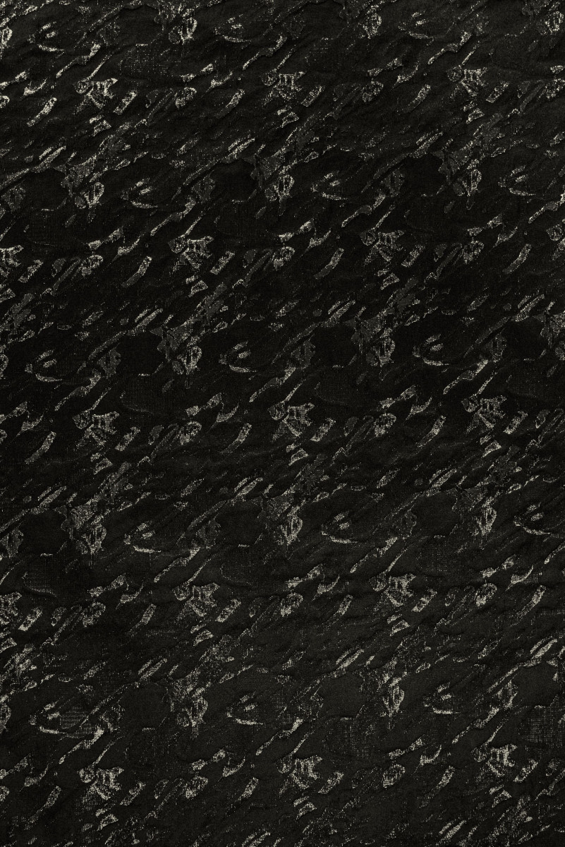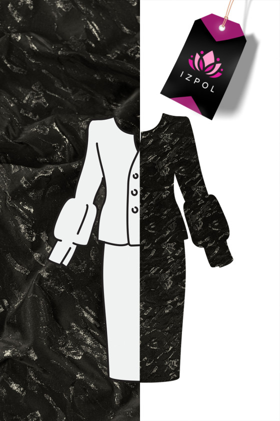 Itališkas žakardo kostiumo audinys juodos spalvos su išgalvotu raštu, dekoruotu juodu ir auksiniu lurekso siūlu. Audinys yra plonesnis, standus, neelastingas, gražiai blizgus. Puikiai tinka siūti kostiumą, suknelę, sijoną ar dekoratyviniais tikslais.