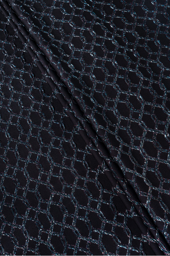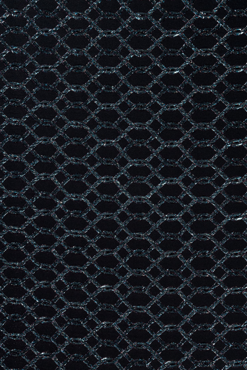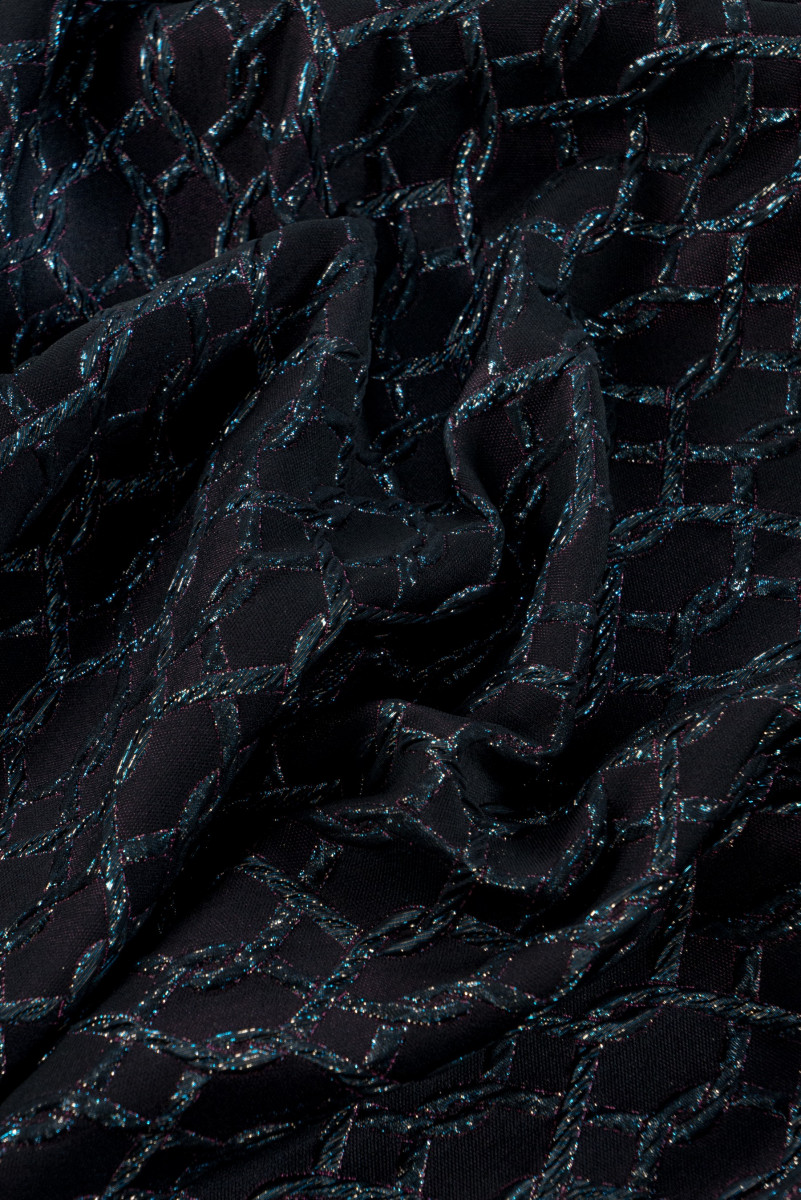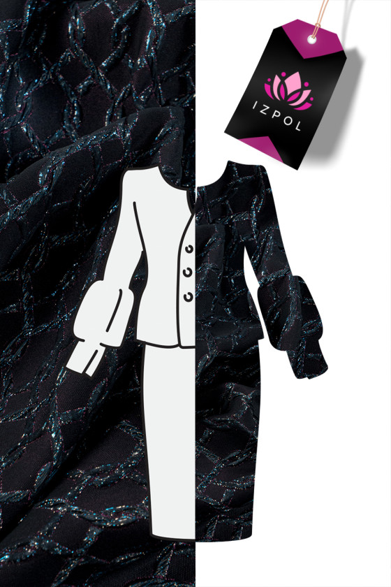 Itališkas žakardo kostiumo audinys juodos ir rožinės spalvos su įspaudais, primenančiais susipynusią stygą, gražiai dekoruotas įvairiaspalviais lurekso siūlais. Audinys yra storesnis, mėsingas, elastingas išilgai audinio ilgio.