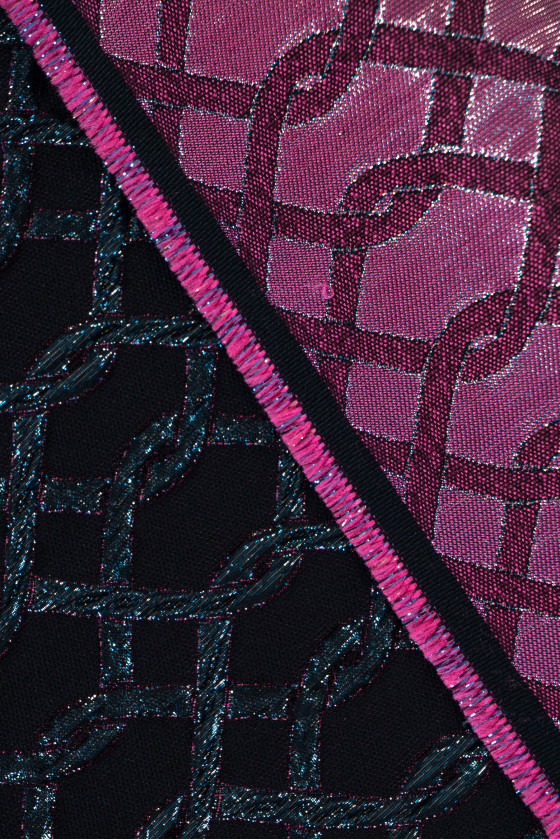 Itališkas žakardo kostiumo audinys juodos ir rožinės spalvos su įspaudais, primenančiais susipynusią stygą, gražiai dekoruotas įvairiaspalviais lurekso siūlais. Audinys yra storesnis, mėsingas, elastingas išilgai audinio ilgio. Puikiai tinka siūti kostiumą, suknelę, sijoną, kelnes ar dekoratyviniais tikslais.