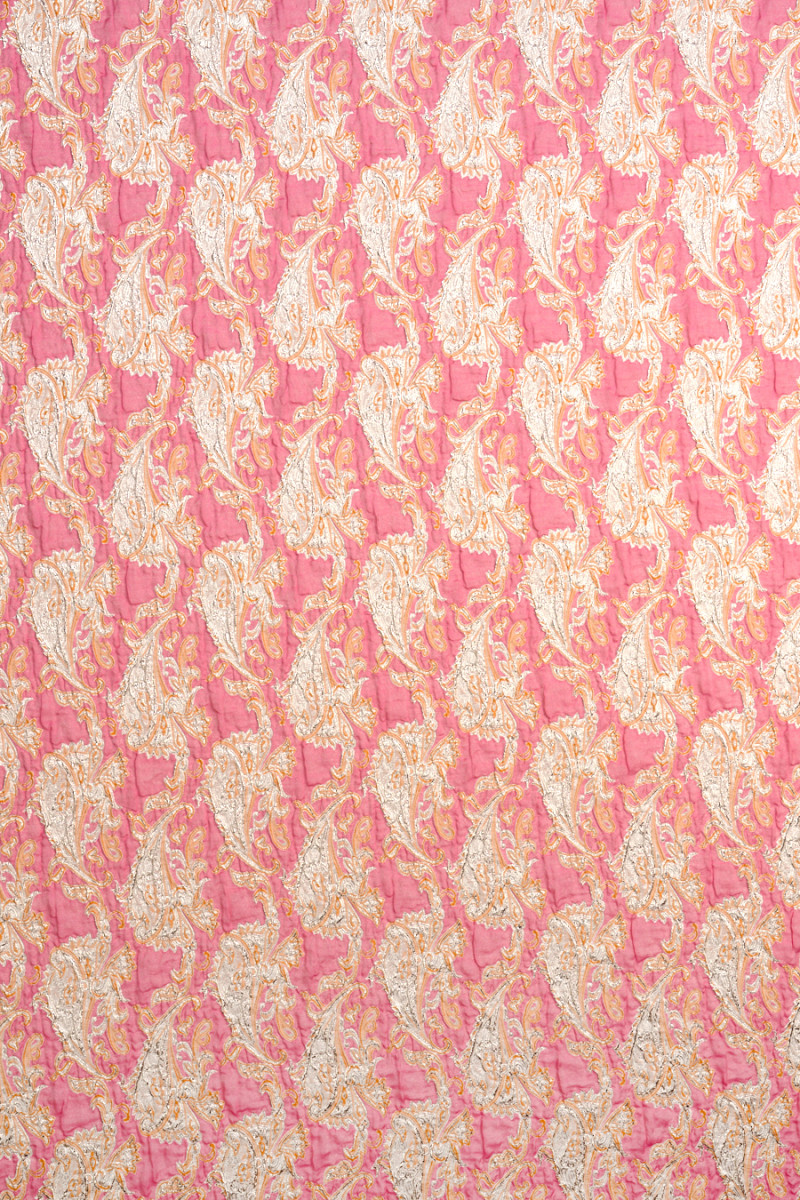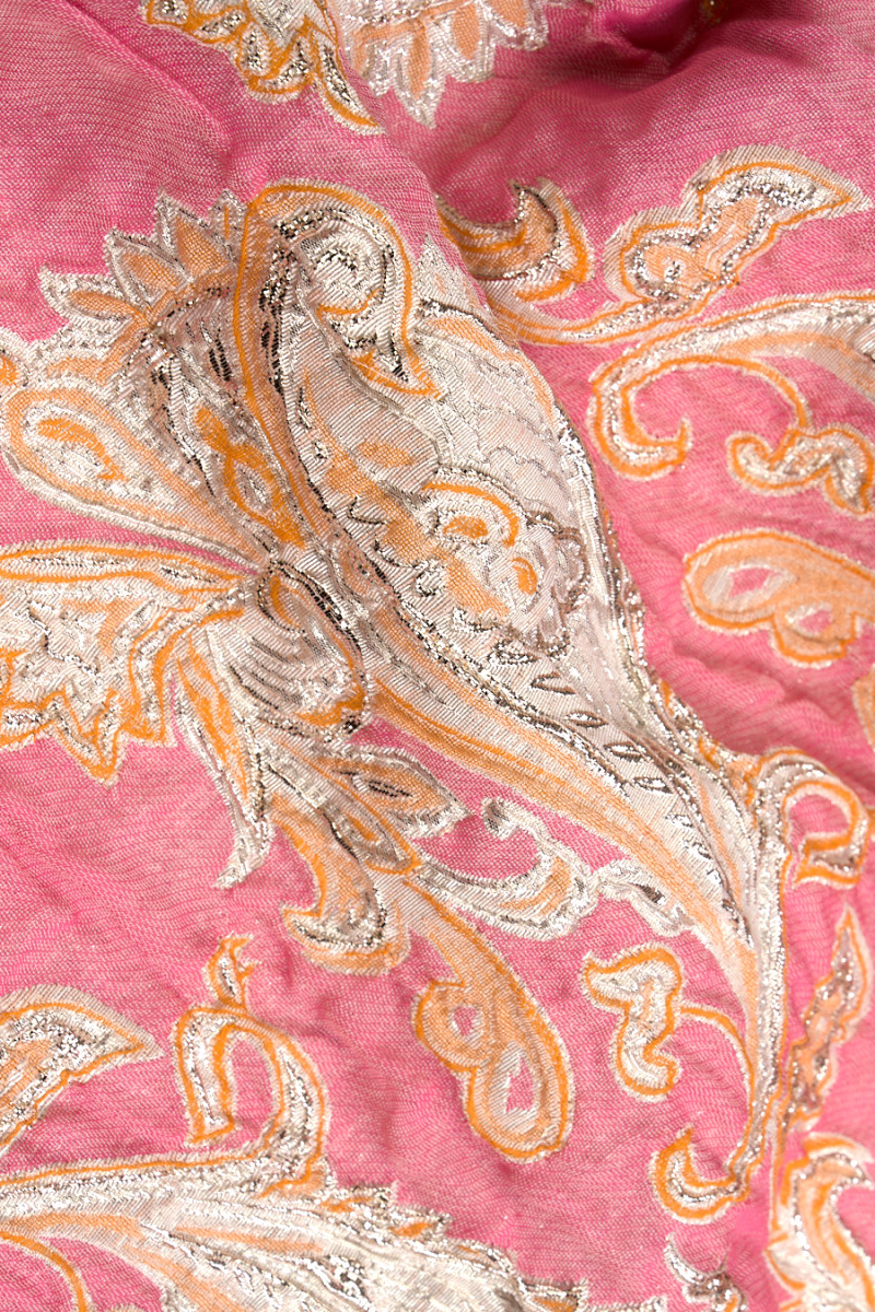 Itališkas žakardo kostiumo audinys rausvos spalvos su tankiu rytietiškų paisley raštų motyvu platinoje su oranžine riba. Audinys yra šiek tiek standus ir turi raukšlėtą, išgaubtą struktūrą. Labai šaunus, pavasarinis pasiūlymas elegantiškos suknelės, sijono ar kostiumo siuvimui.