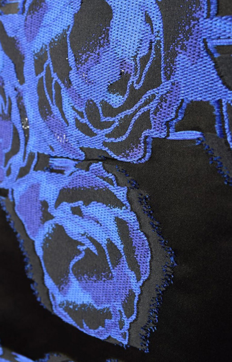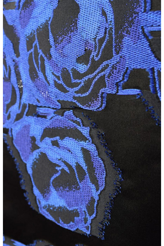 Itališkas žakardo kostiumo audinys su dideliu gėlių motyvu. Medžiaga su juodos spalvos taftos struktūra su išsiuvinėtais, dideliais mėlynos spalvos gėlių raštais - rugiagėlė. Kraštų raštai yra baigti smulkiais kutais, kurie suteikia audiniui struktūrizuotą išvaizdą. Jis yra plonas, bet standus, labai plastikas. Tai puikiai tinka elegantiškos suknelės, sijono ar kostiumo siuvimui.