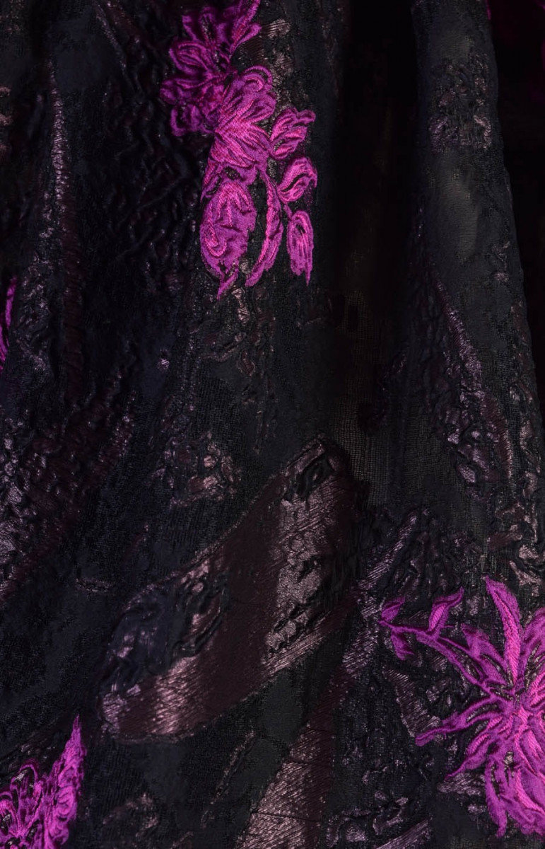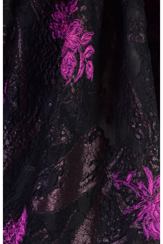 Fenomenali juoda organza su žakardo tekstūra su fuksijos gėlėmis ir rudais bei bordo, netaisyklingais elementais. Audinys yra standus, neelastingas, šiek tiek skaidrus ir labai lengvas. Puikiai tinka sijonams, suknelėms.