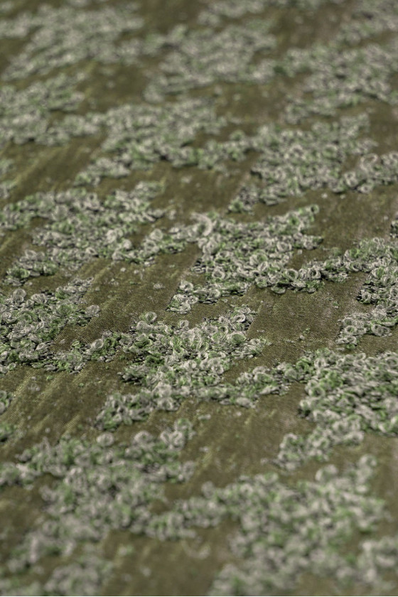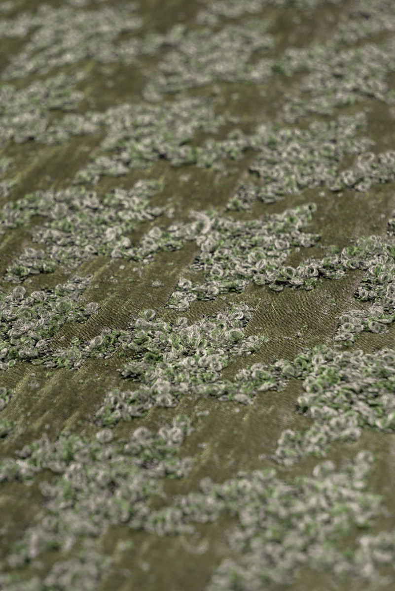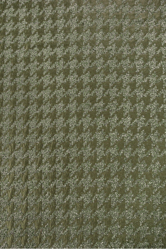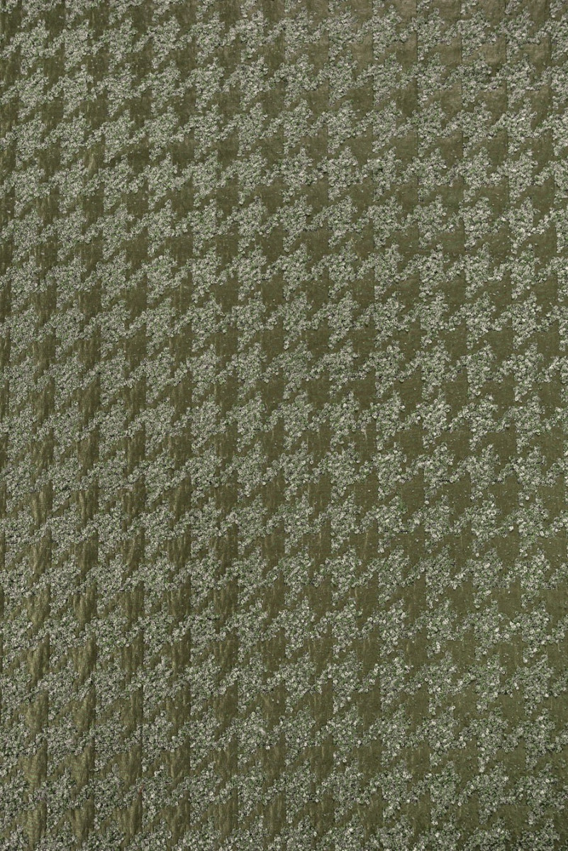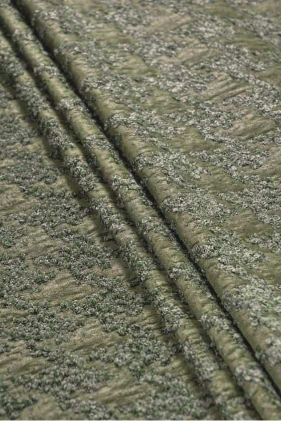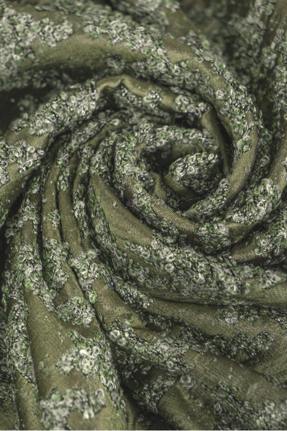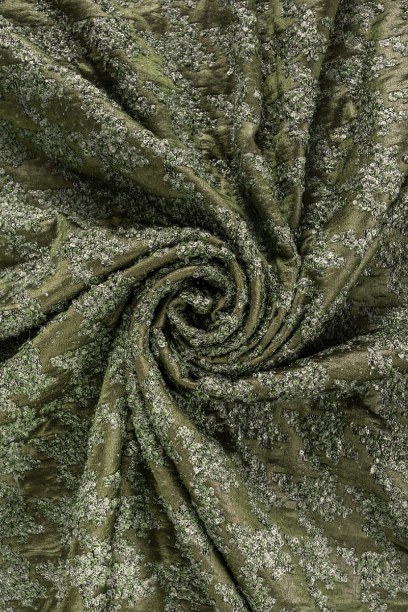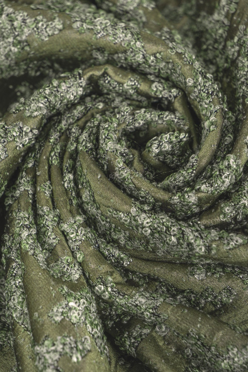 Žakardo boucle vištienos pėda, austa iš poliesterio, alyvuogių žalia. Storesnis, neelastingas, blizgus audinys. Įdomus pasiūlymas siuvimo striukėms ar ploniems paltams.