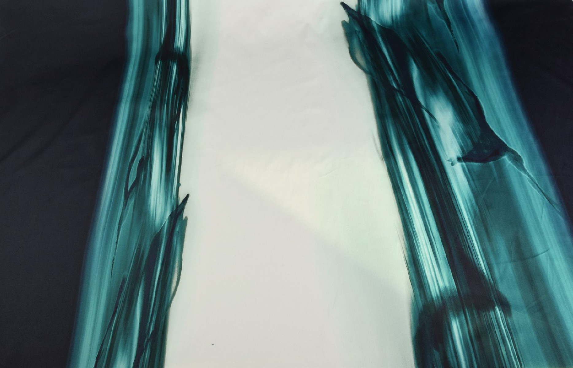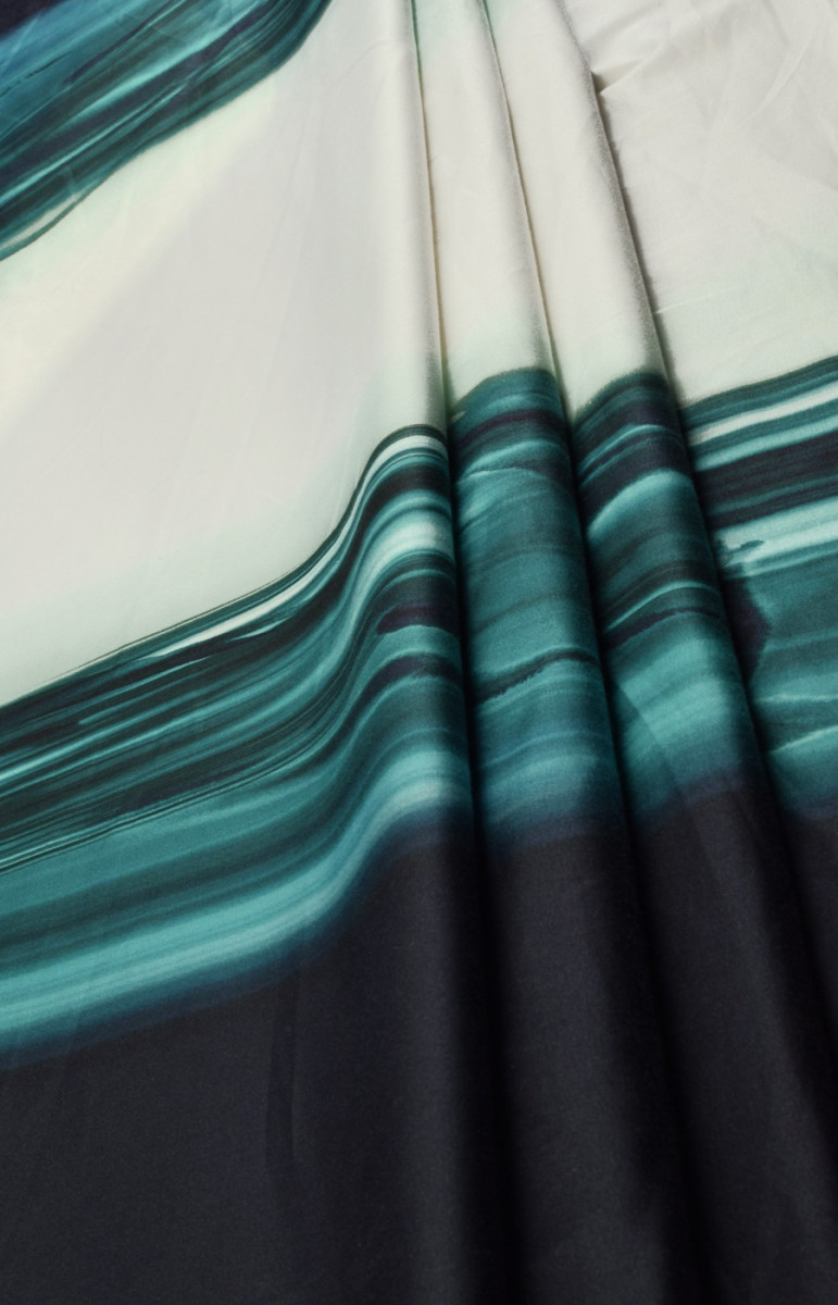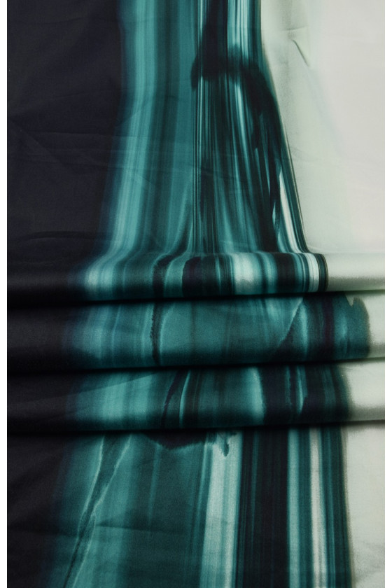 Storesnė medvilnė su elastanu su netaisyklingomis juostelėmis šiomis spalvomis: tamsiai tamsiai mėlyna, jūros žalia ir labai šviesi mėtų. Atsižvelgiant į jūros žalumą, neryškūs delfinų siluetai.