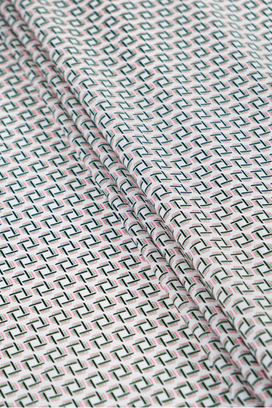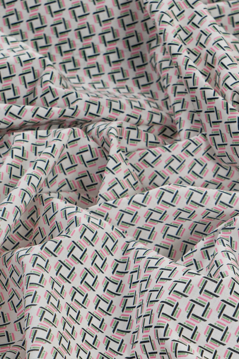 Itališka, elastinga marškinių medvilnė su mažu, geometriniu raštu (1,5 cm) juoda su rausva ir žalia kremo fone. Puikiai tinka siūti marškinius, palaidinę, suknelę.