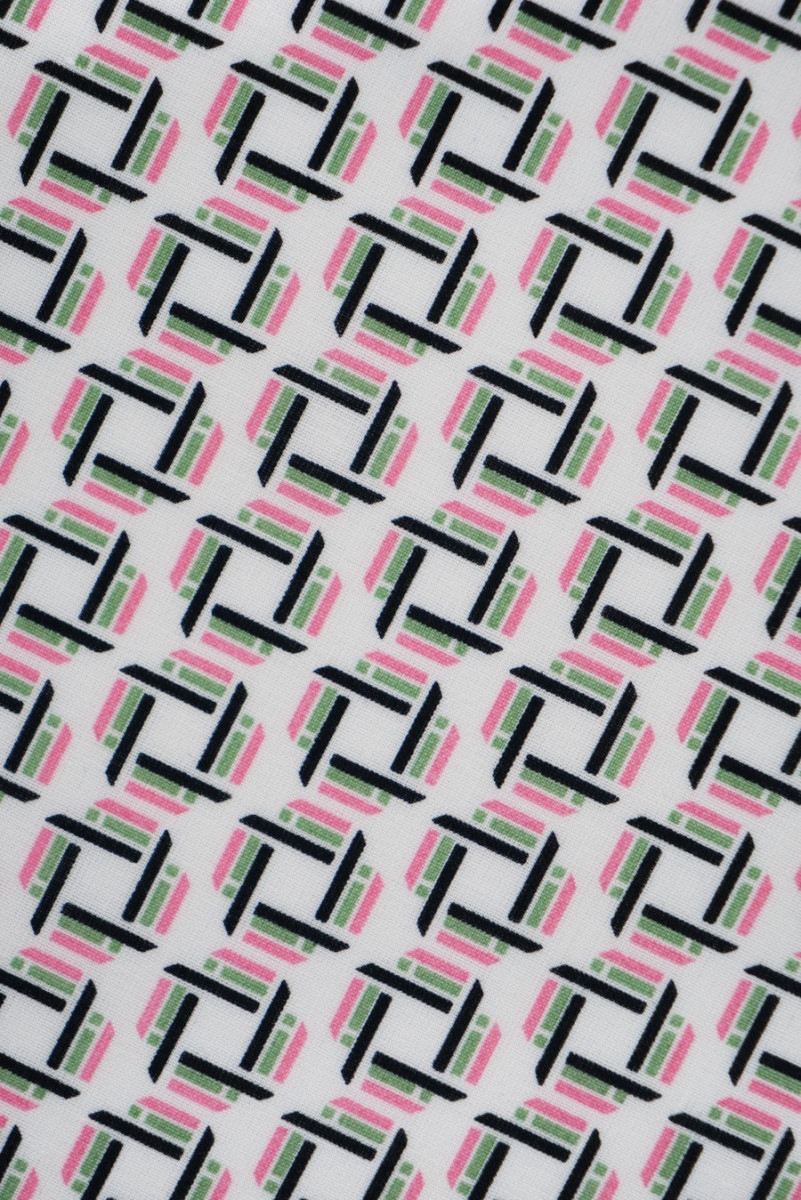 Itališka, elastinga marškinių medvilnė su mažu, geometriniu raštu (1,5 cm) juoda su rausva ir žalia kremo fone.