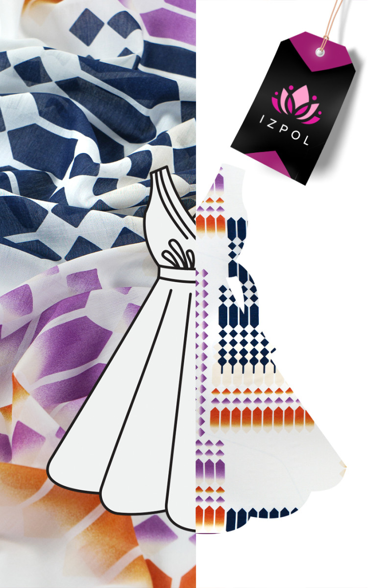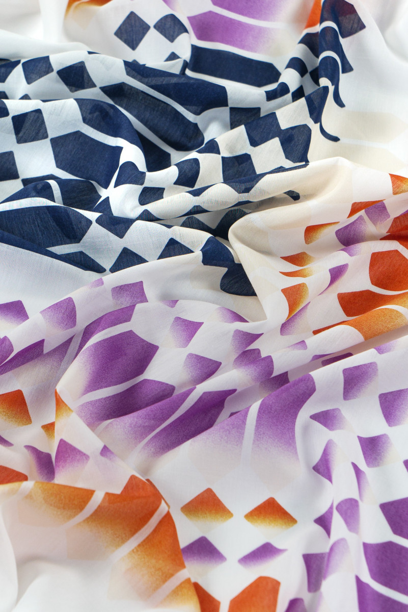 Itališkas šilko ir medvilnės batiste audinys su spalvingais, geometriniais raštais kremo fone.