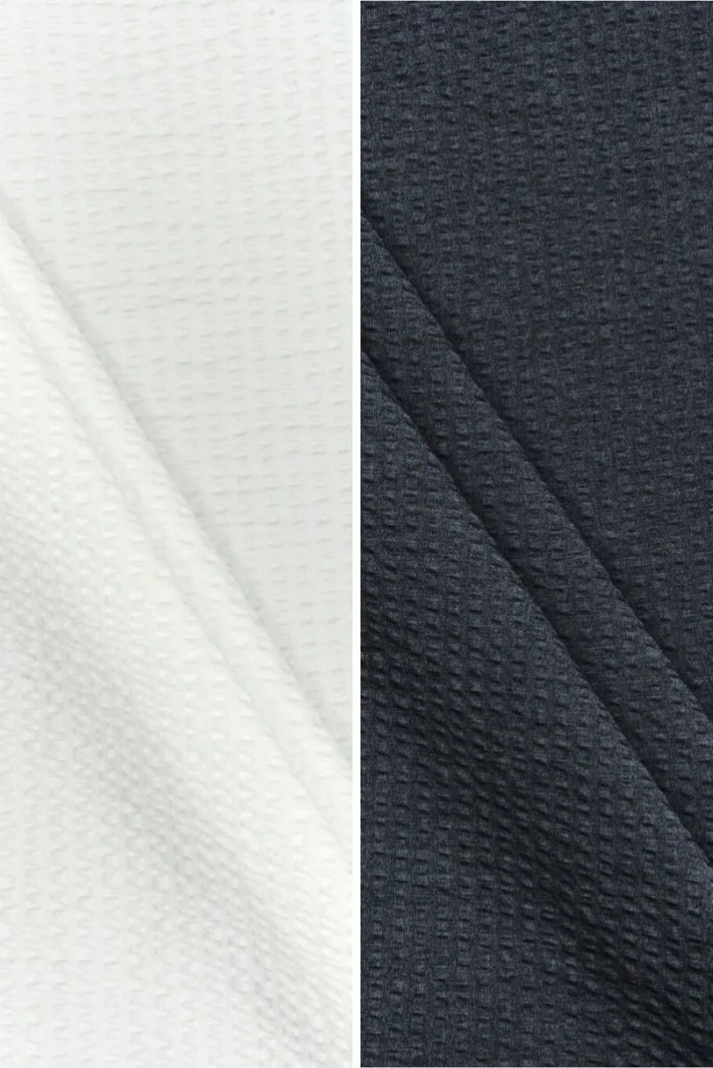 Itališkas medvilninis audinys su subtilia, užmaskuota struktūra yra dviejų spalvų - grietinėlės ir melanžo, tamsiai tamsiai mėlynos spalvos. Audinys yra vidutinio storio, minkštas, elastingas, nepermatomas, o poliesterio pridėjimas daro jį patvaresnį. Rekomenduojame prie suknelių, sijonų, taip pat palaidinių ir šortų.