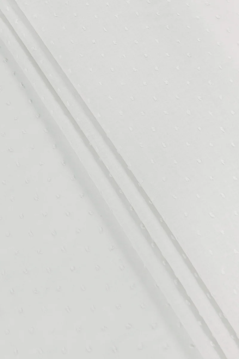 Itališkas 100% medvilnės batisto tipo audinys baltos spalvos su "mazgo" motyvu. Audinys yra plonas, neelastingas ir skaidrus. Medvilninis batistas yra natūralus, subtilus, erdvus, šiek tiek skaidrus audinys - puikiai tinka vasaros karščiams. Puikiai tinka siūti palaidinę, sijoną, suknelę.