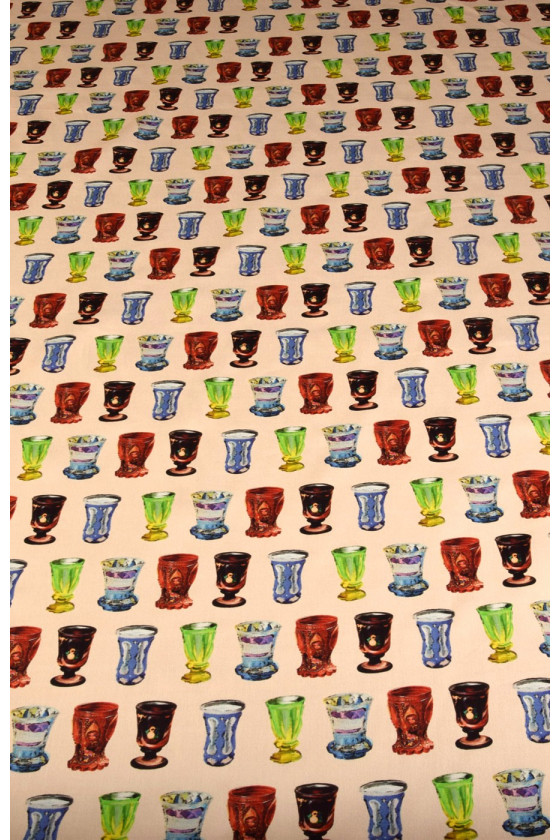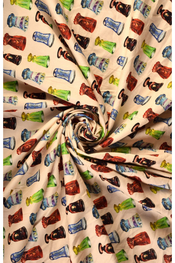 Labai įdomus taurių atspaudas ant šiek tiek elastingos medvilnės. Nepermatomas audinys, vidutinio storio. Puikiai tinka suknelėms, kelnėms, sijonams.