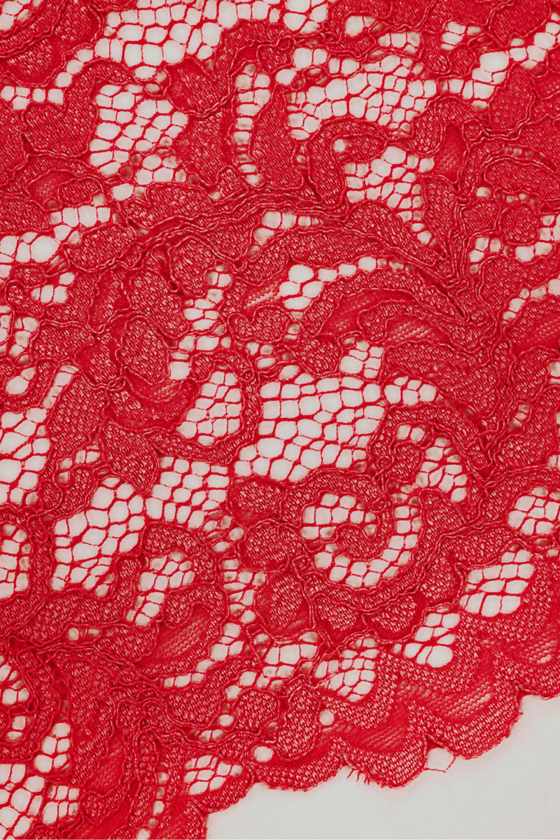 Itališki nėriniai raudonai. Audinys turi tankų gėlių motyvą, sujungtą su tinkleliu ir baigtą virvele. Karūna iš abiejų pusių baigiama dekoratyviniu dantimi - mes siuvame jį perimetru. Labai gražus pasiūlymas žmonėms, kurie mėgsta klasikines, stiprias spalvas.