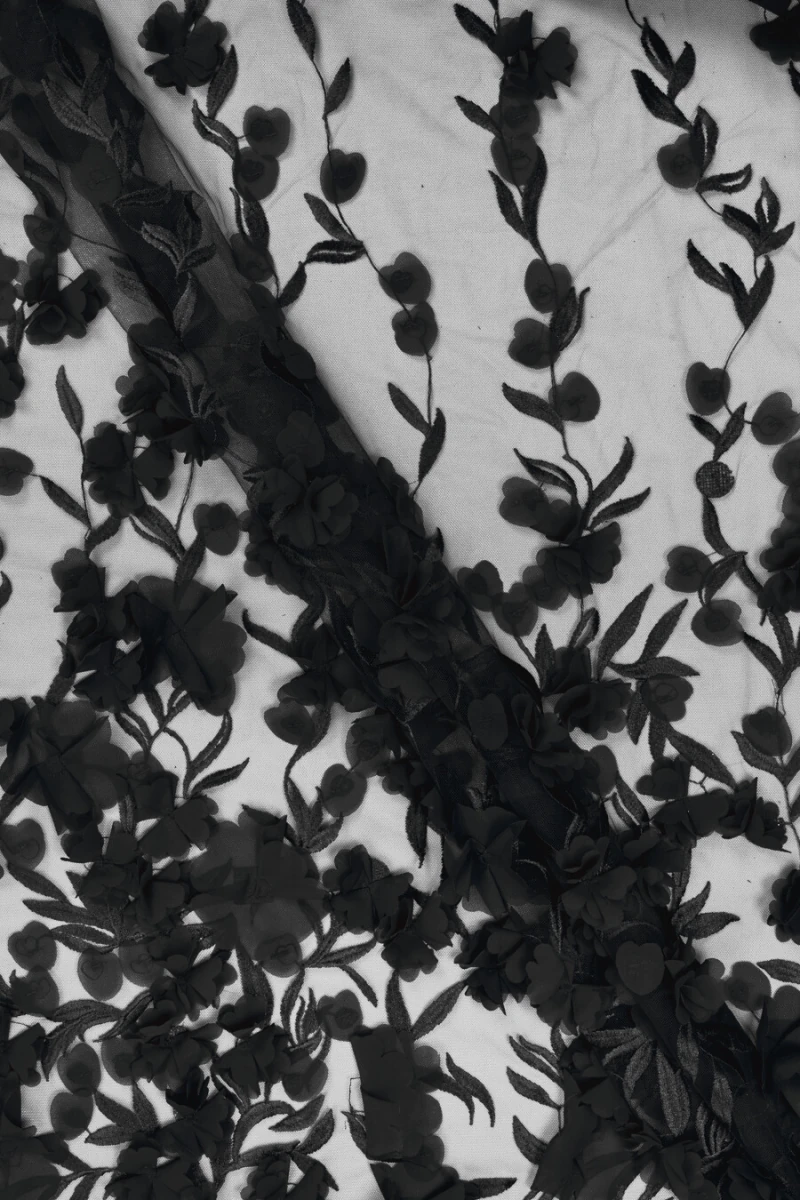 Itališkas vakarinis audinys juodas. Ant elastingos, juodos akies, lapai ir šakelės yra išsiuvinėtos juodos spalvos šifono gėlėmis. Visas modelis sutirštėja link vieno audinio krašto, gėlės šiek tiek "išlenda", sukurdamos 3D efektą - mes siuvame jį perimetriškai. Gražus pasiūlymas žmonėms, mėgstantiems originalius audinius, jis taip pat puikiai tiks prie vestuvinės suknelės.