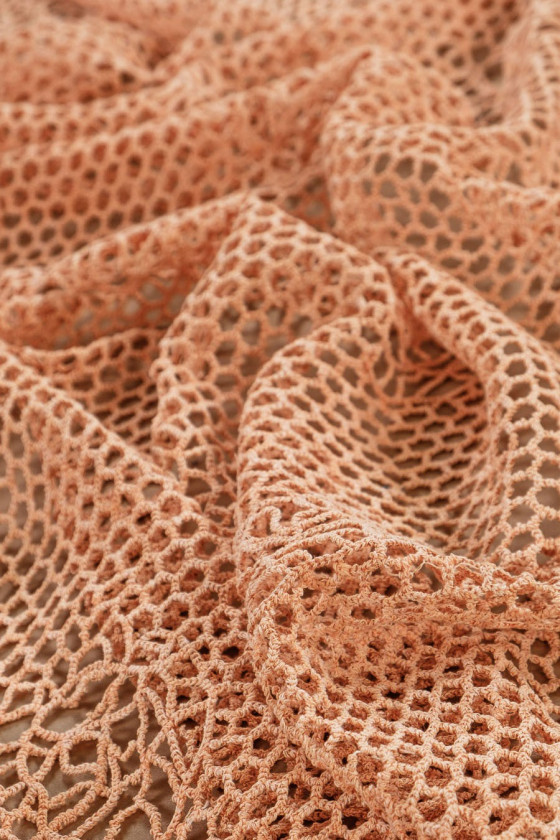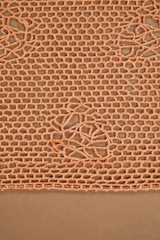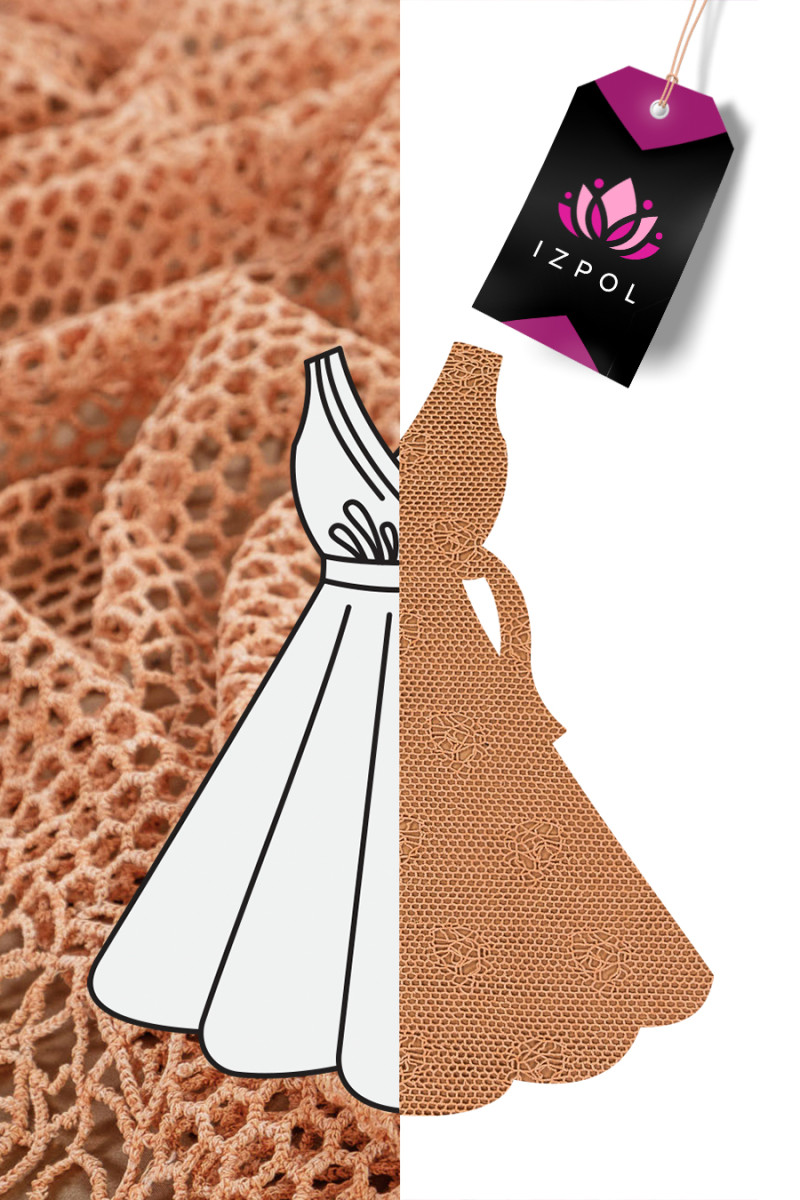 Guipure nėriniai su akių struktūra apelsinų lašišoje. Puikiai tinka ažūrinėms suknelėms ar palaidinėms.