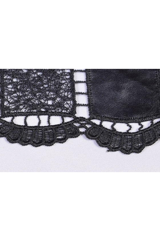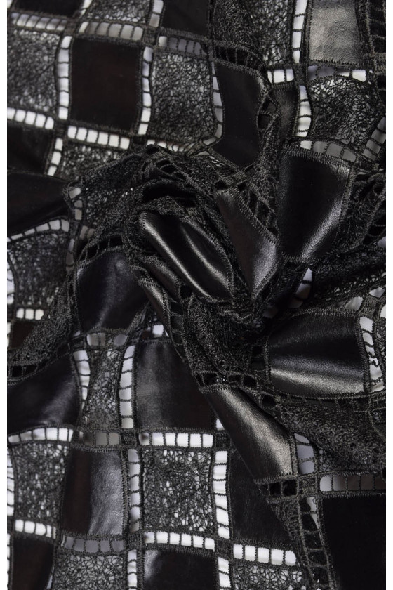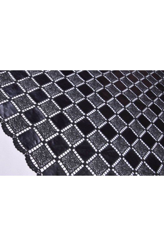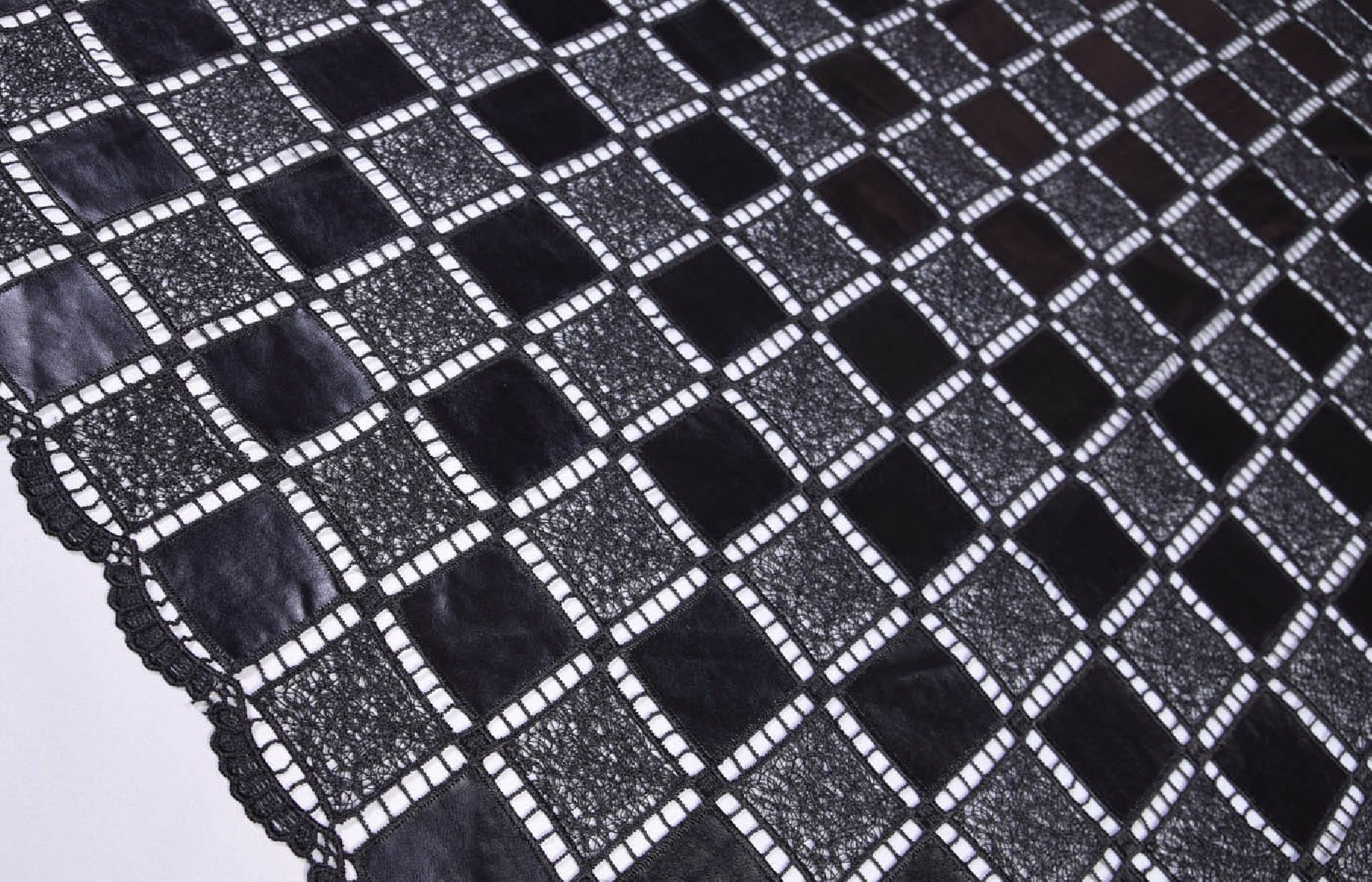 Nėriniai derinami su ekologine oda. Šaškių lentos raštas. Baigta dantimi iš abiejų pusių. Audinys yra labai fenomenalus.