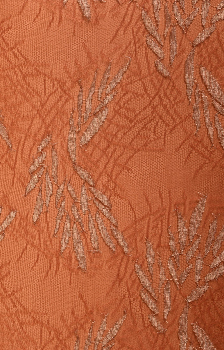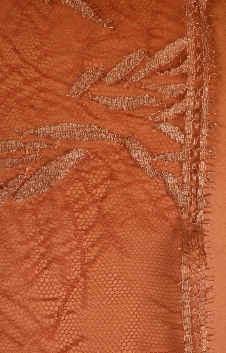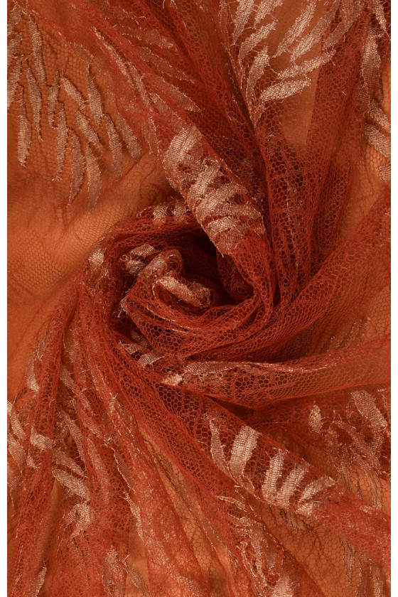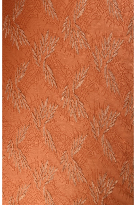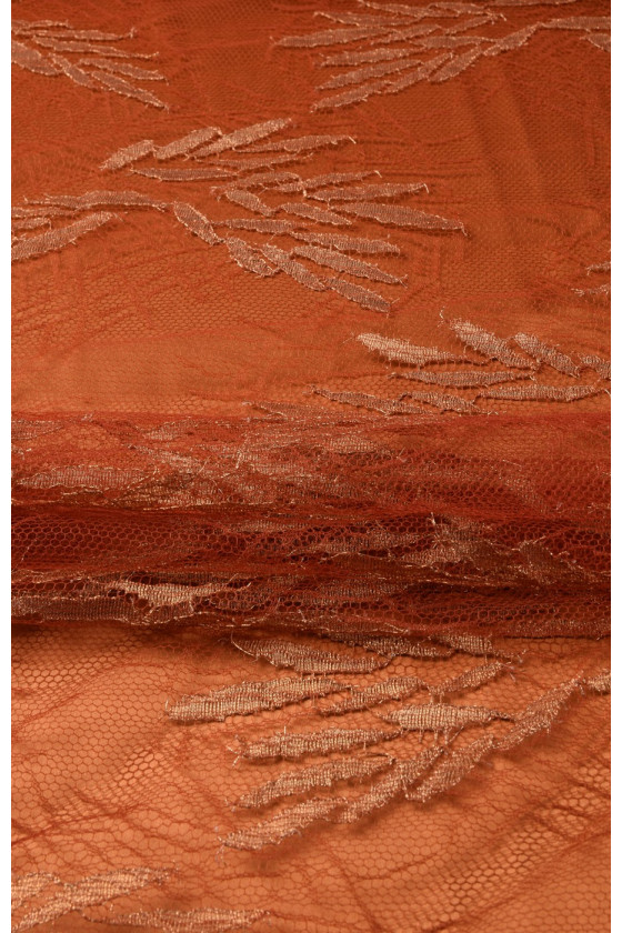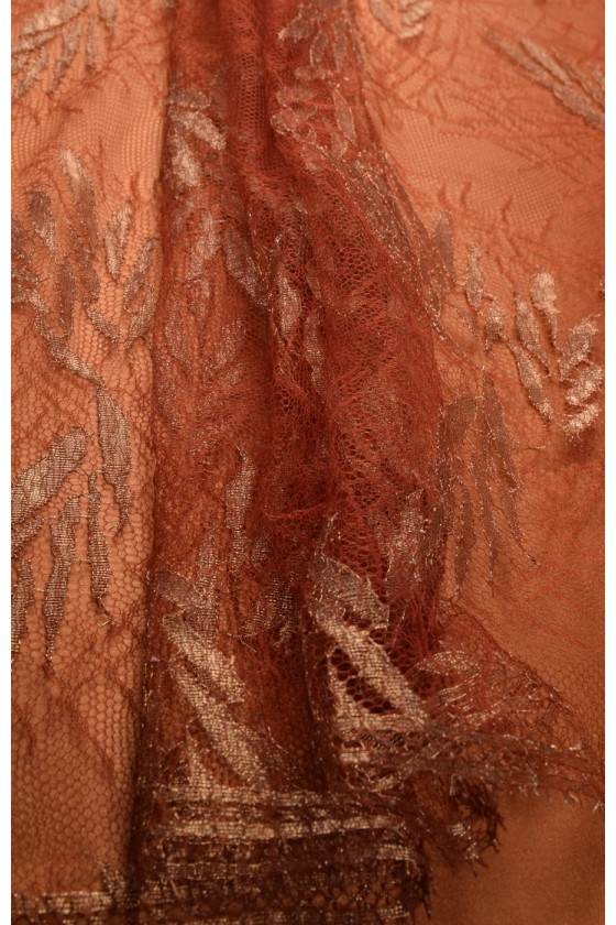 Gražūs prancūziški nėriniai rausvai aukso spalvos su lurekso siūlais. Jis gali būti naudojamas siūti palaidinę, suknelę ar įdėklus. Tam rekomenduojame šilko satino pamušalą.