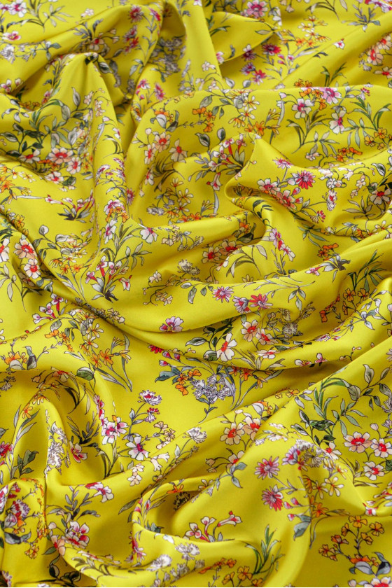 Itališkas poliesterio satinas su mažomis, ryškiomis gėlėmis geltoname fone. Poliesterio satinas yra aksominis audinys su subtiliu blizgesiu.