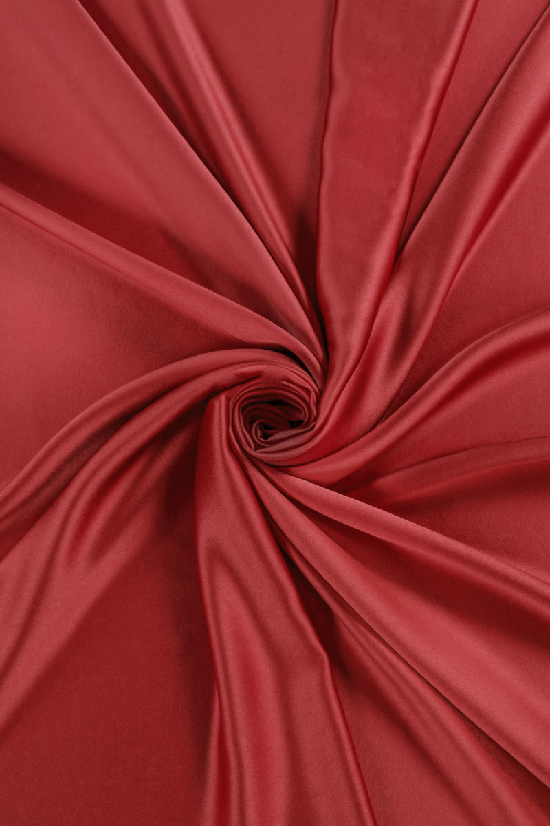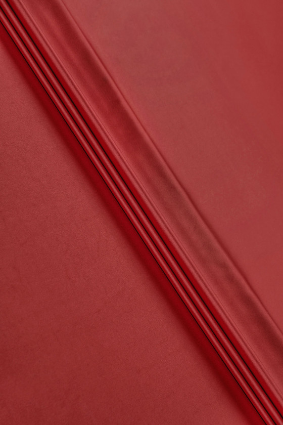 Itališkas cadi suknelės audinys tamsiame korale. Viena vertus, jis yra kilniai blizgus, kita vertus, jis yra matinis - jis gali būti siuvamas iš abiejų pusių.
