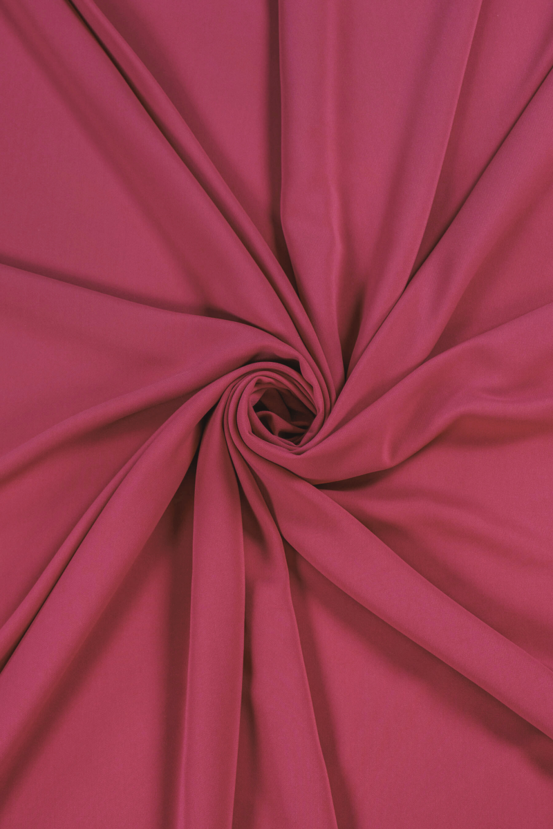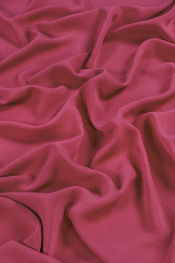 Itališkas cadi suknelės audinys tamsios, vėsios rožinės spalvos. Cadi suknelės audinys yra nepermatomas, mėsingas, tekantis (sunkus), matinis, šiek tiek elastingas ant pluoštų