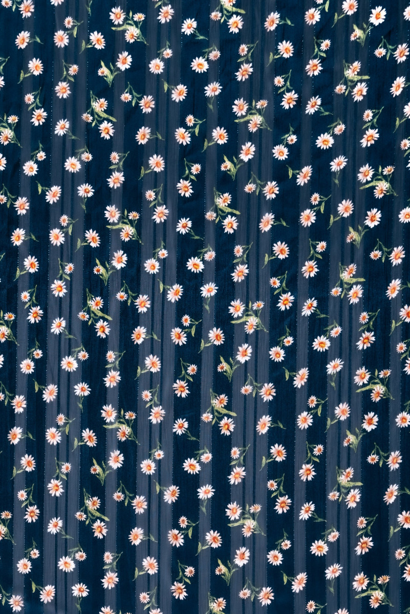 Italijos poliesterio šifonas iš devore rūšies tamsiai mėlynos spalvos su mažų gėlių (pievos) motyvu. Devore audinys yra šifono derinys su papildomomis satino juostelėmis.