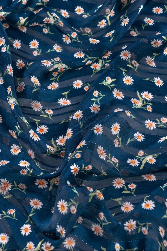 Italijos poliesterio šifonas iš devore rūšies tamsiai mėlynos spalvos su mažų gėlių (pievos) motyvu. Devore audinys yra šifono derinys su papildomomis satino juostelėmis. Audinys yra plonas, skaidrus, neelastingas, labai subtilus. Puikiai tinka siūti erdvią palaidinę, sijoną, suknelę ar skarą.