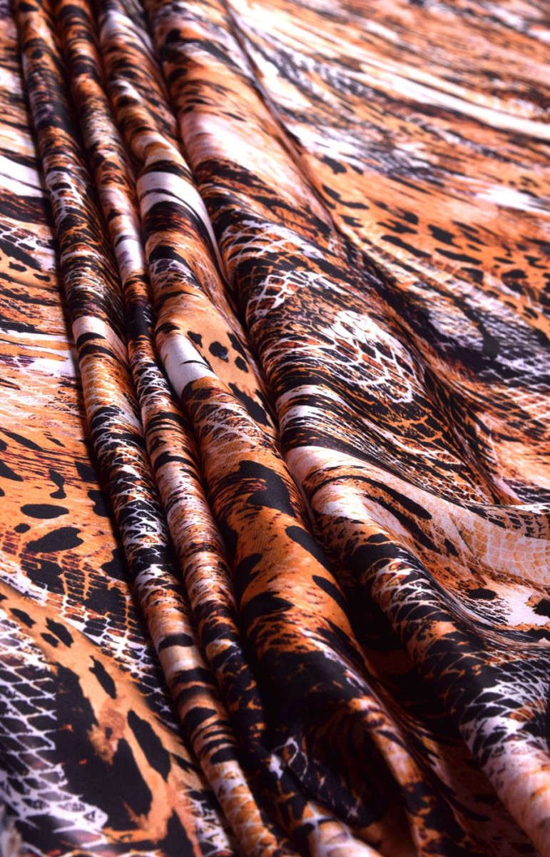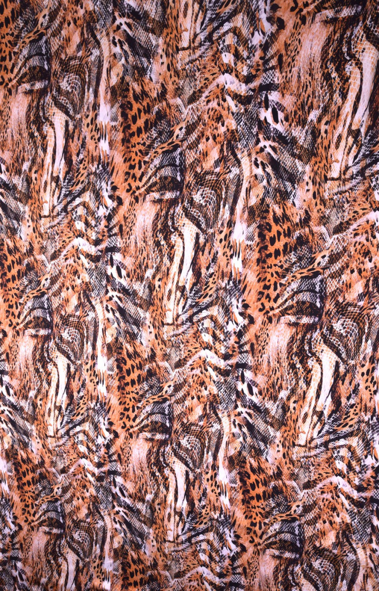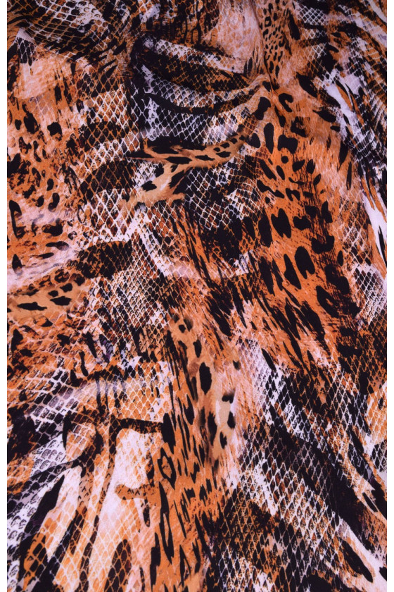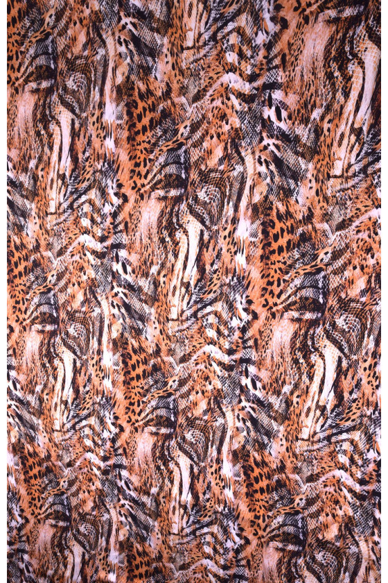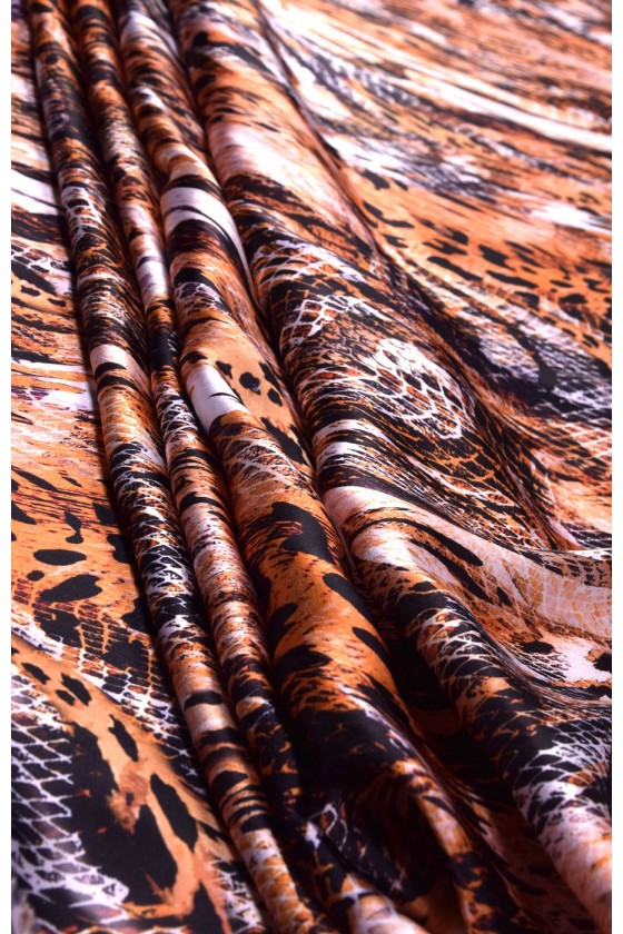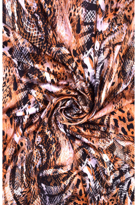 Satinas, pagamintas iš poliesterio su gyvūnų modeliu. Rekomenduojame iš jo siūti sukneles, palaidines ir sijonus. Audinys yra sunkus, tekantis, gerai tinka. Jis nėra matomas, galite siūti jį be pamušalo. Gramatažas taip pat tinka moteriškų marškinių siuvimui. Spalvos: oranžinė, juoda, ecru.