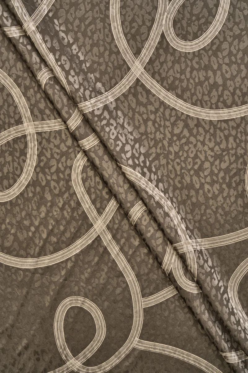 Itališkas poliesterio audinys su juostelės ir leopardo atspaudo motyvu tamsiai smėlio spalvos fone. Žakardo leopardo atspaudas, pagamintas iš satino pynimo. Šviesiai smėlio spalvos juostelės yra 13 mm pločio. Audinys yra lengvas, erdvus, elastingas, plonas, bet nepermatomas. Labai įdomus pasiūlymas, kuris gražiai atrodys siūta suknele, sijonu, taip pat palaidine ar marškiniais.