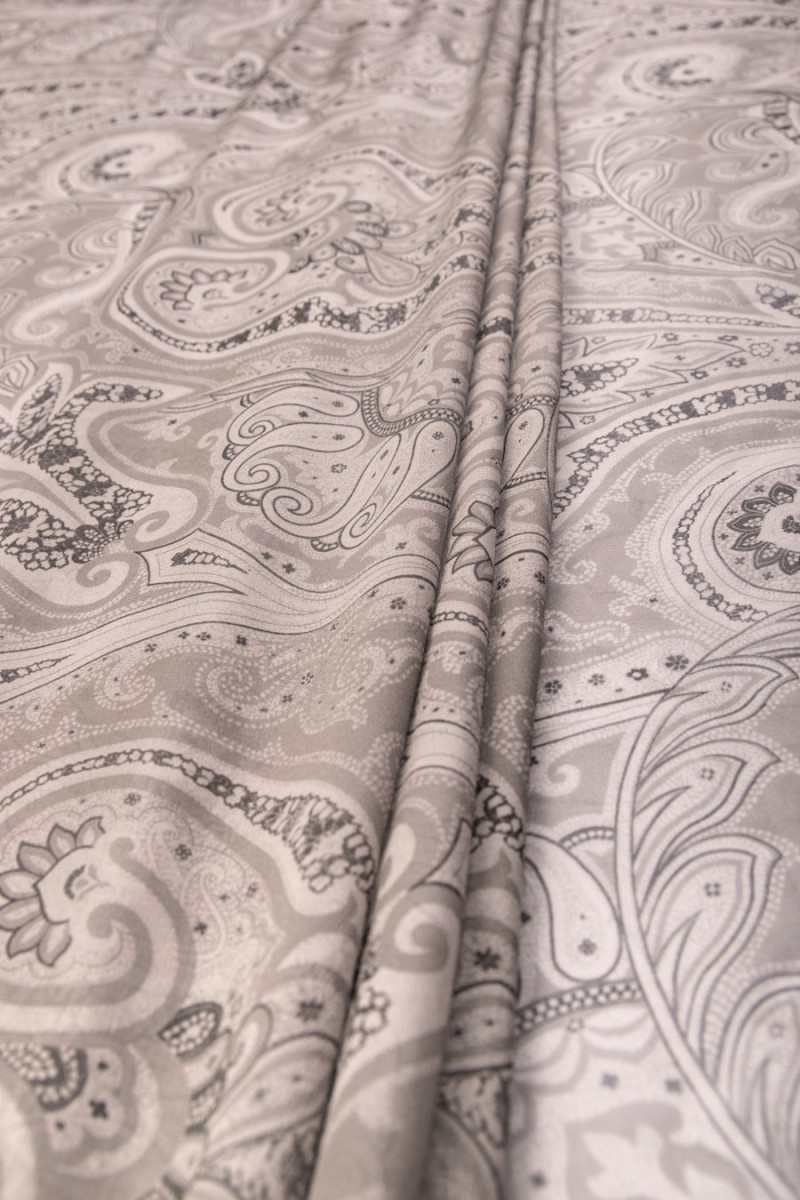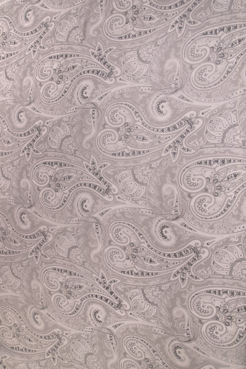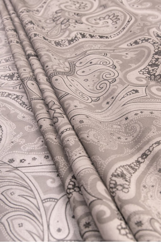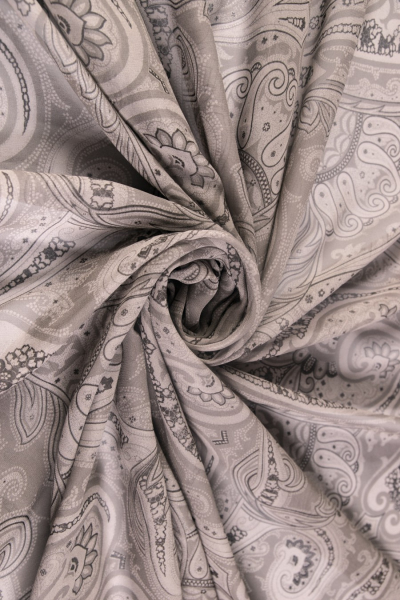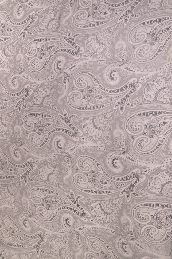 Šilko šifono rytietiškas paisley modelis pilkos spalvos atspalviais su juoda spalva. Tai labai subtilus, skaidrus audinys (reikalingas pamušalas). Puikiai tinka erdvioms suknelėms ir palaidinėms. Pasiūlymas vasaros karščiui, 100% natūralus audinys, labai erdvus.