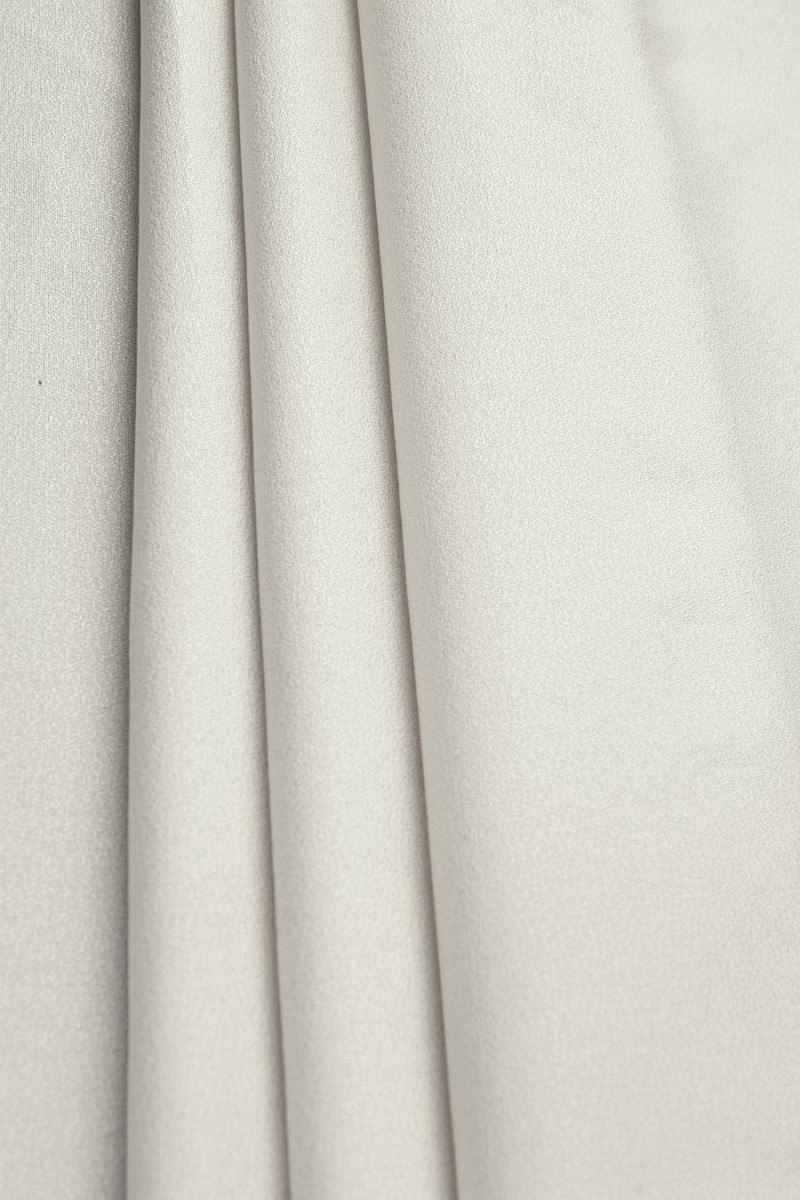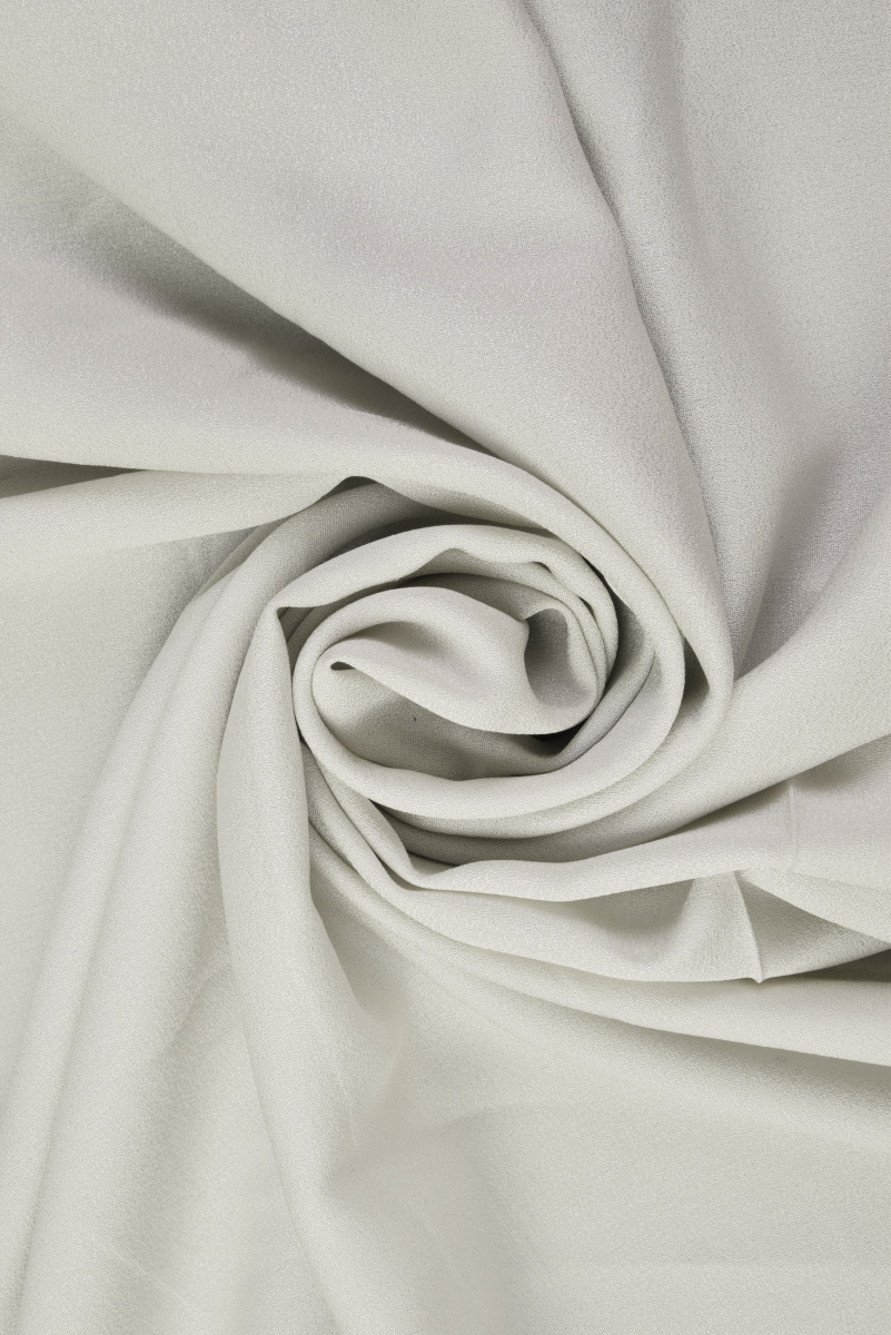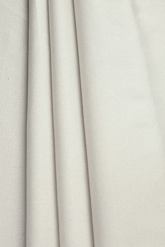 Šilko audinys šviesiai pelenų spalvos su pynimu, panašiu į georgette. Nepermatomas, matinis audinys gražiai priglunda prie figūros.