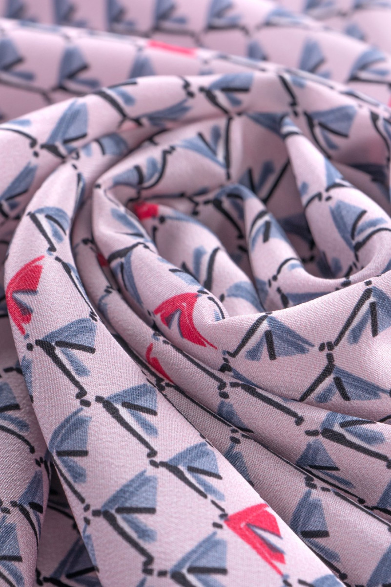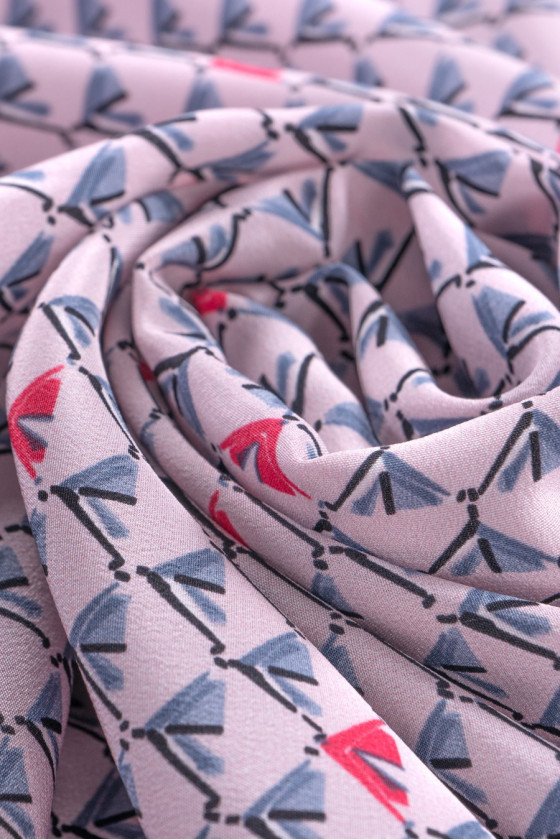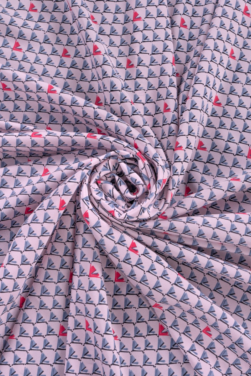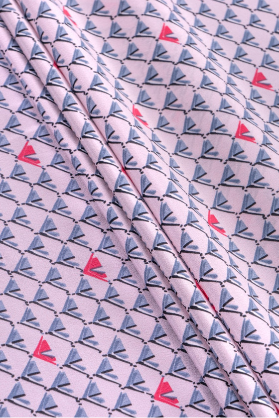 100% žinomo italų mados dizainerio šilko krepas su mažu, taisyklingu pilkos ir koralų spalvos raštu šviesiai rausvame fone. Šilko krepas yra subtilus, plonas, bet nepermatomas, pusiau matinis audinys. Jis gali būti naudojamas erdvioms suknelėms, subtilioms palaidinėms, šalikams, šalikams