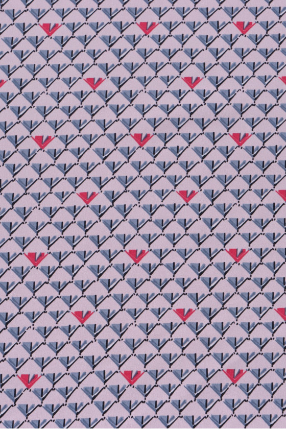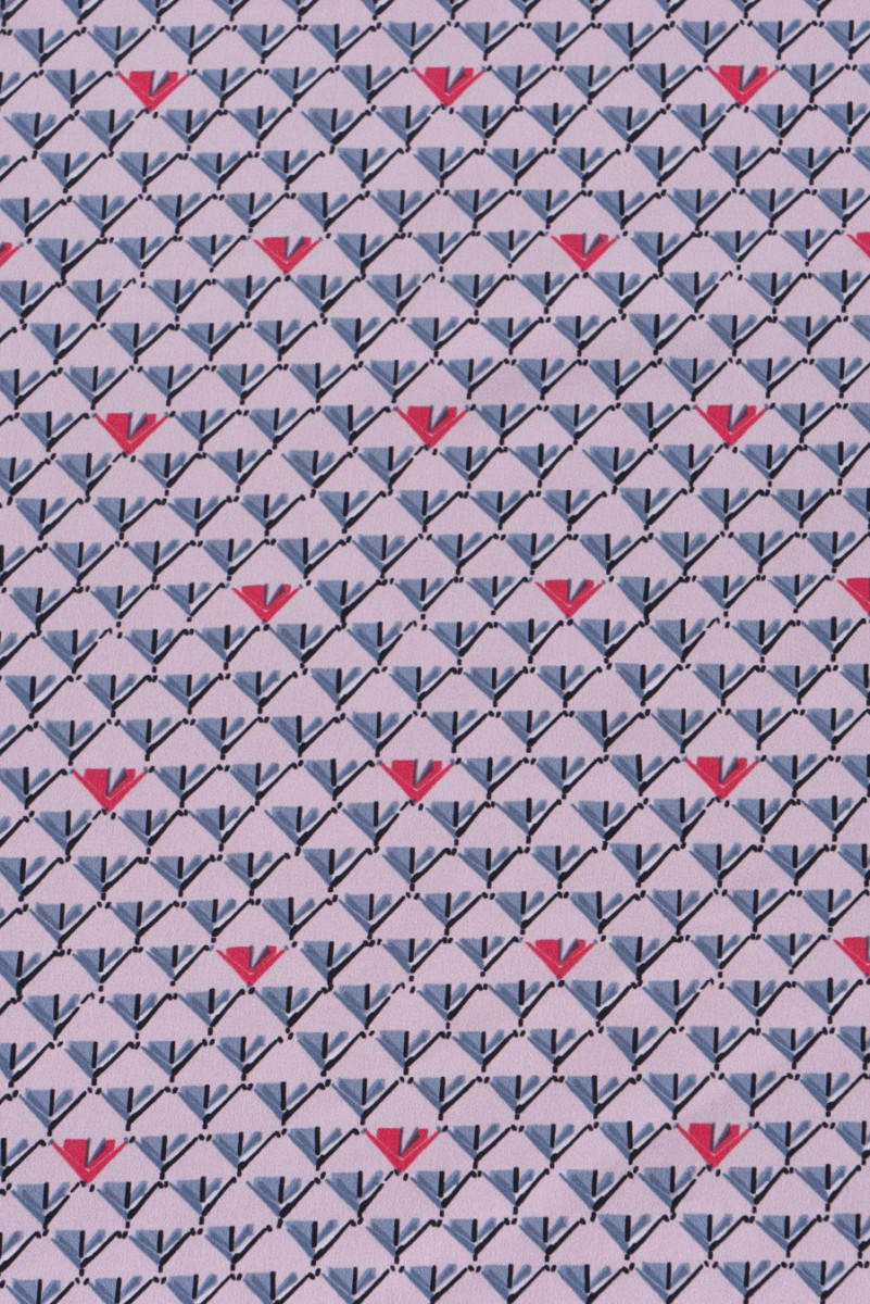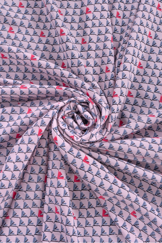 100% žinomo italų mados dizainerio šilko krepas su mažu, taisyklingu pilkos ir koralų spalvos raštu šviesiai rausvame fone. Mes rekomenduojame jį elegantiškai aprangai.