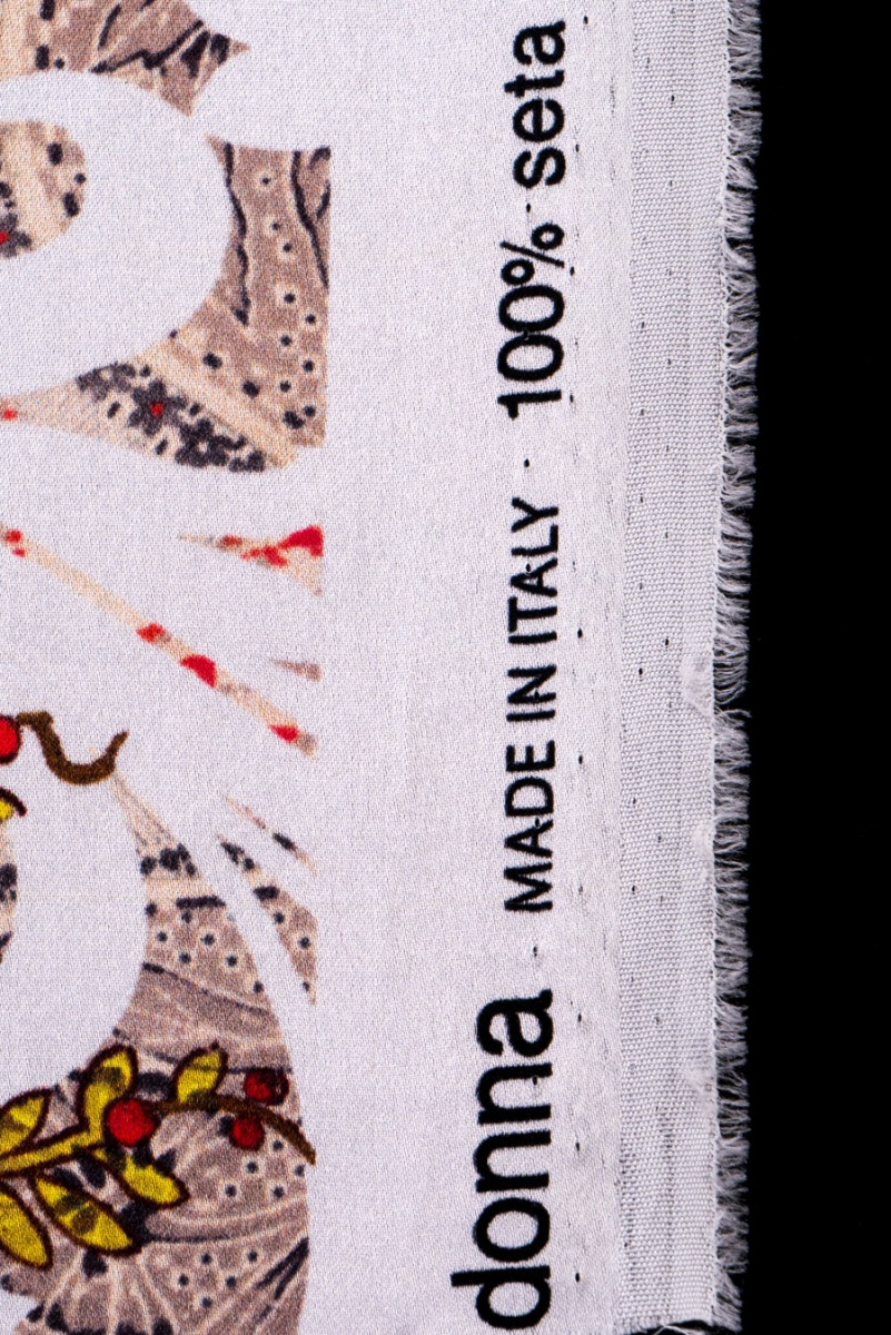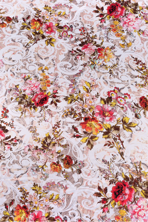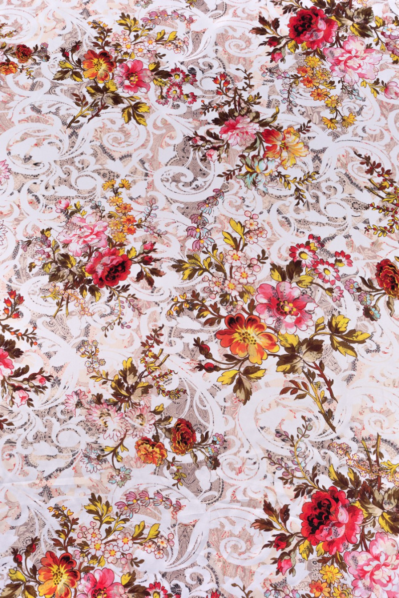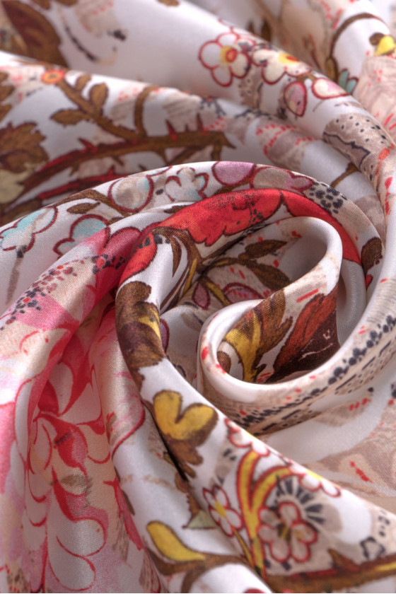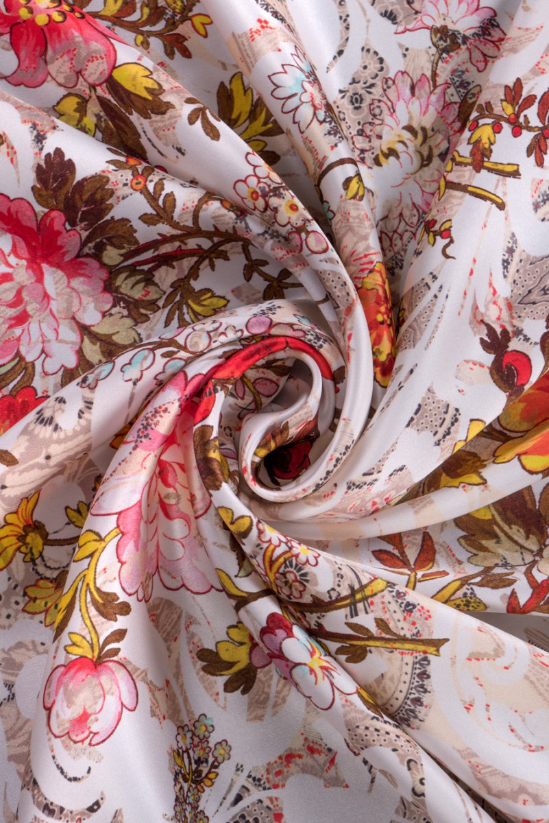 100% šilko satinas su žakardo modeliu grietinėlėje ir smėlio spalvos su spalvingų gėlių puokščių atspaudu. Šilko satinas yra subtilus audinys, aksominis liesti, subtilus blizgesys.