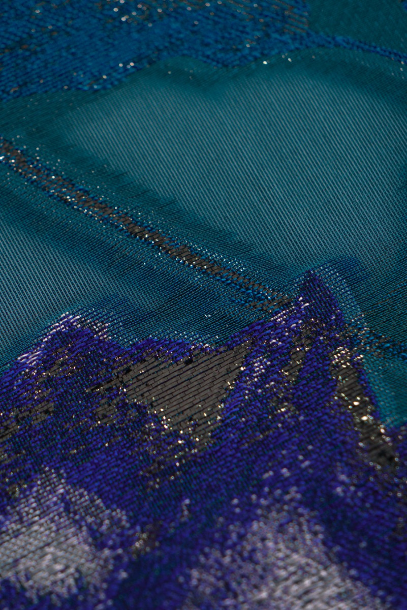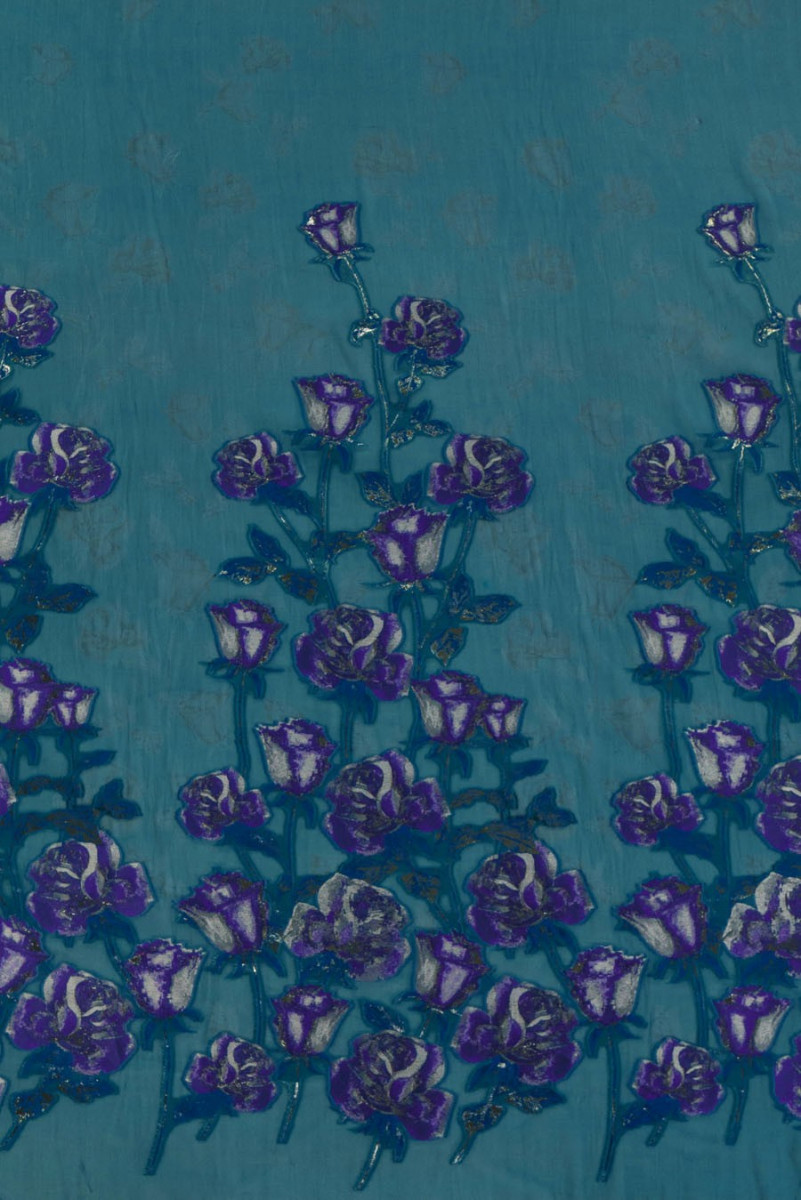 Itališko šilko organza jūros žalia su siuvinėtomis sidabro-rugiagėlių gėlėmis ir dažytomis gėlėmis juodai. Raštas sudarytas iš trijų simetriškų gėlių motyvų, kurių aukštis 115 cm, o tai praranda tankį link audinio centro. Jis gražiai dekoruotas blizgančiais siūlais, kurie suteikia jam elegancijos. Audinys pateikiamas kuponu, kurio matmenys yra 150 cm * 145 cm.