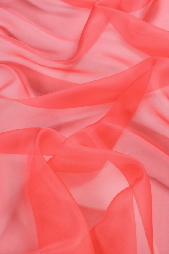 Itališkas 100% organza šilko audinys koralų spalvos. Natūralaus šilko organza yra plonas, skaidrus, bet standus audinys, pasižymintis subtiliu blizgesiu, būdingu šilko audiniams. Puikiai tinka siūti suknelę, palaidinę, marškinius, sijoną.