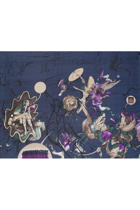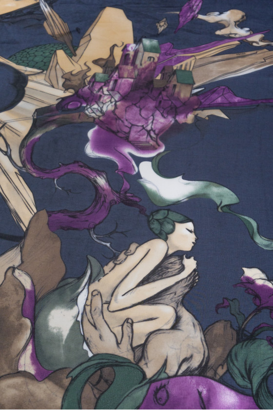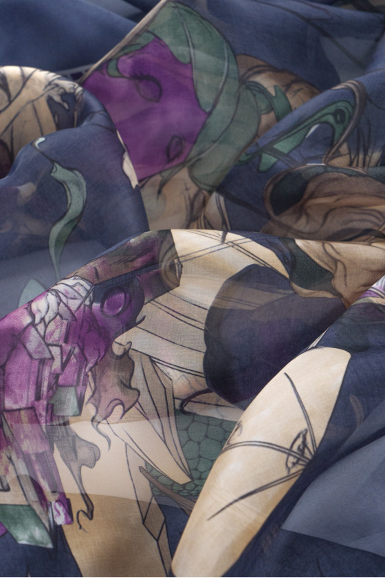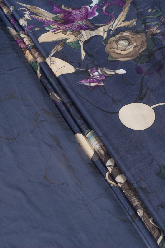 Itališkas 100% šilko organzos audinys kupono dydis 135 cm*140 cm. Gražus išgalvotų personažų motyvas grafito fone, audinys, pasirašytas gerai žinomo mados namų pavadinimu.