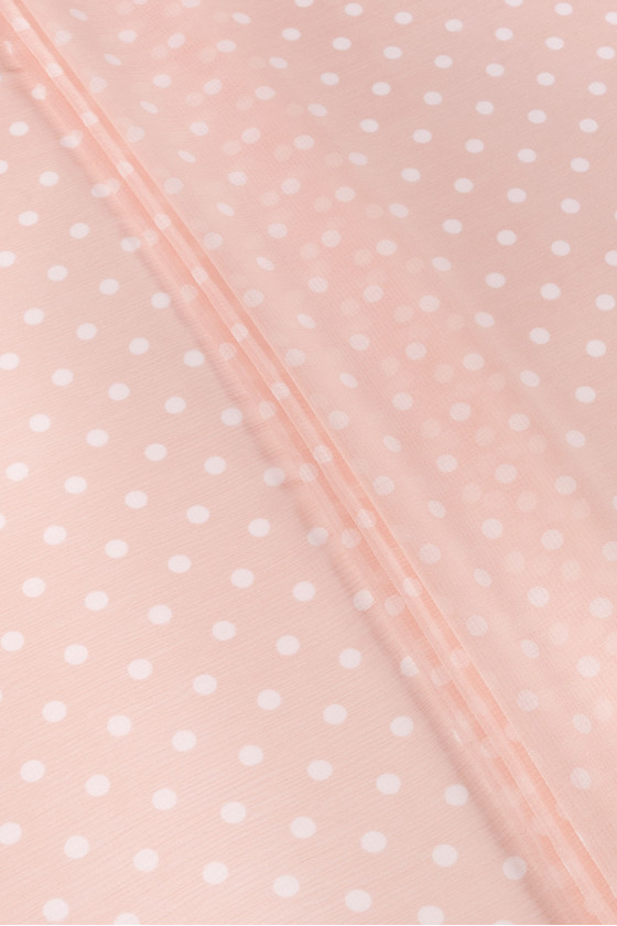 Itališkas šifonas 100% šilkas su raukšlėta (suglamžyta) struktūra šviesiai rausvos spalvos su baltais polka taškais. Audinys papildomai dekoruotas sidabro lurekso siūlu. Šifonas, pagamintas iš natūralaus šilko, yra labai subtilus, erdvus ir skaidrus audinys. Puikiai tinka erdvioms suknelėms ir palaidinėms. Šiek tiek elastingas audinys.