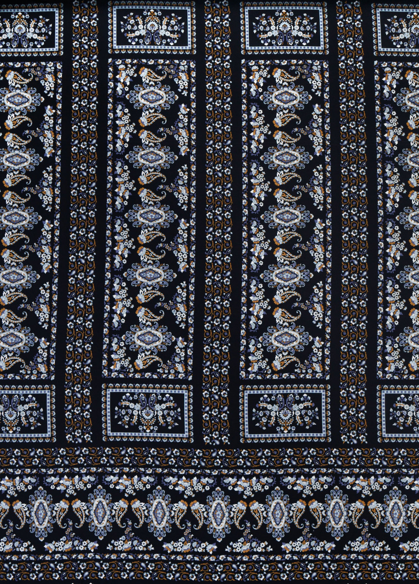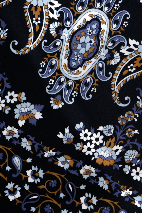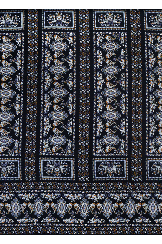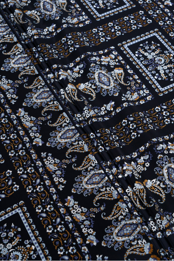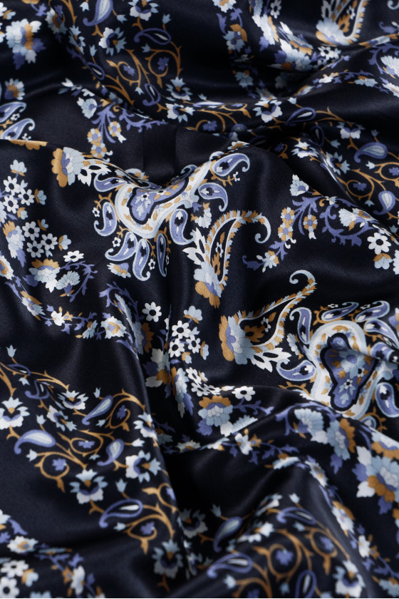Itališkas satinas 100% šilkas kupono dydis 130 cm* 140 cm. Audinys su gražiu, rytietišku motyvu juodame fone.