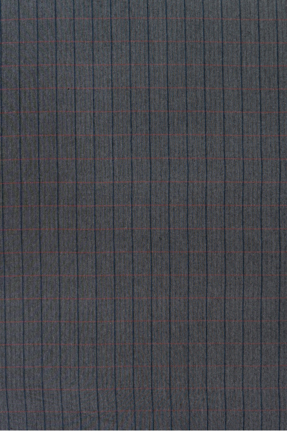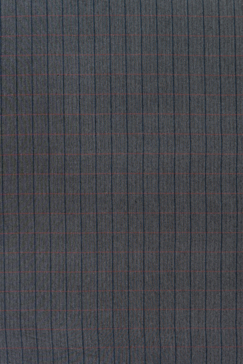 Itališkas kostiuminis audinys, 100% šilkas su vilnos pynimu, pasaulinio lygio kokybė. Pilkos ir juodos spalvos audinys su silkės kaulo motyvu ir bordo bei mėlynos spalvos čekiu, 4 cm * 5 cm dydžio.