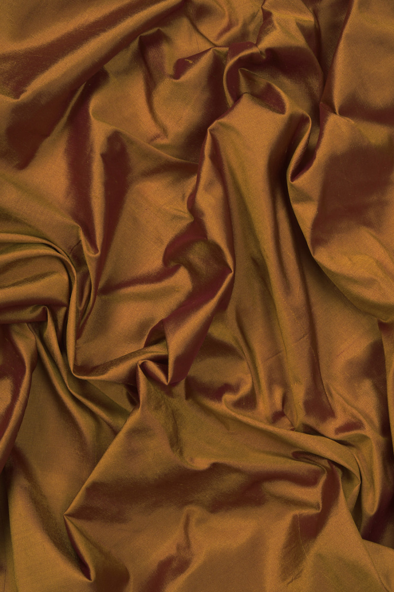 Itališkas 100% šilko šantongo audinys, austas iš dviejų spalvų siūlų: garstyčių ir bordo, kurie sukuria dviejų atspalvių efektą. Lygesnis audinys su nedideliais sustorėjimais.