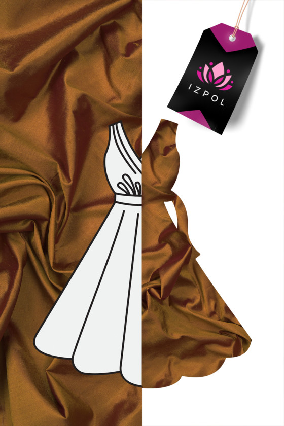 Itališkas 100% šilko taftos audinys, austas iš dviejų spalvų siūlų: garstyčių ir bordo, kurie sukuria dviejų atspalvių efektą. "Shantung" yra šilko audinio rūšis, pagaminta iš žaliavinių verpalų, su būdingais netaisyklingai paskirstytais, vienkartiniais sustorėjimais (dekoratyviniais siūlais su siūlais) atauduose. Ji turi šiek tiek standžią, plastikinę struktūrą. Jis tinka tiek drabužiams, tiek vidaus apdailai - užuolaidoms, pagalvėms ir kt. Jis dažomas natūraliai, todėl jį valome tik chemiškai.