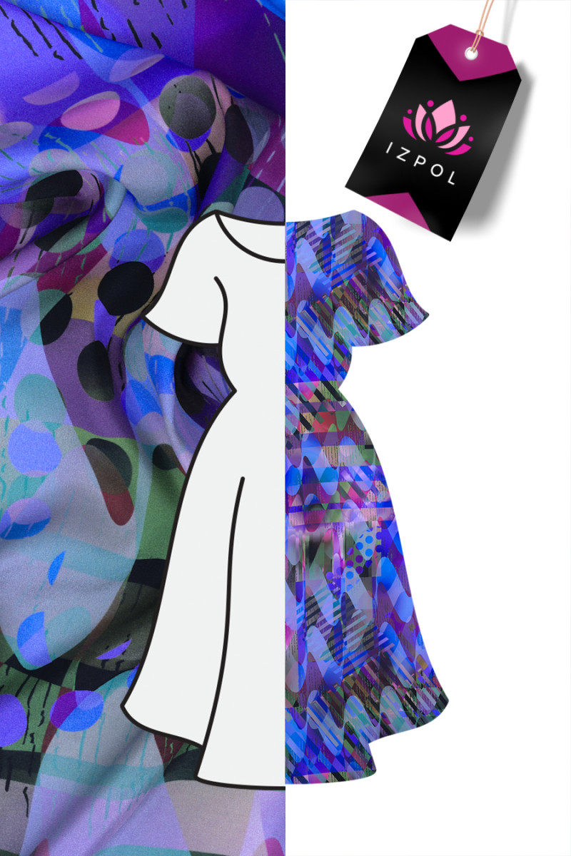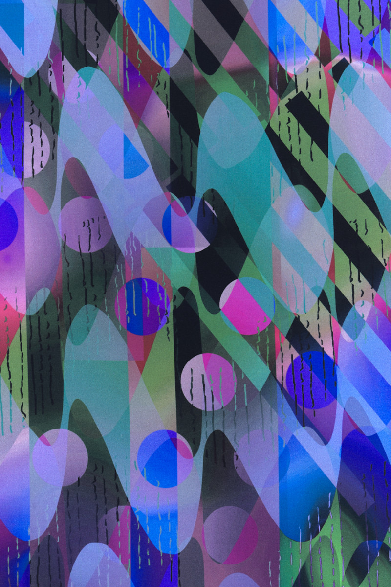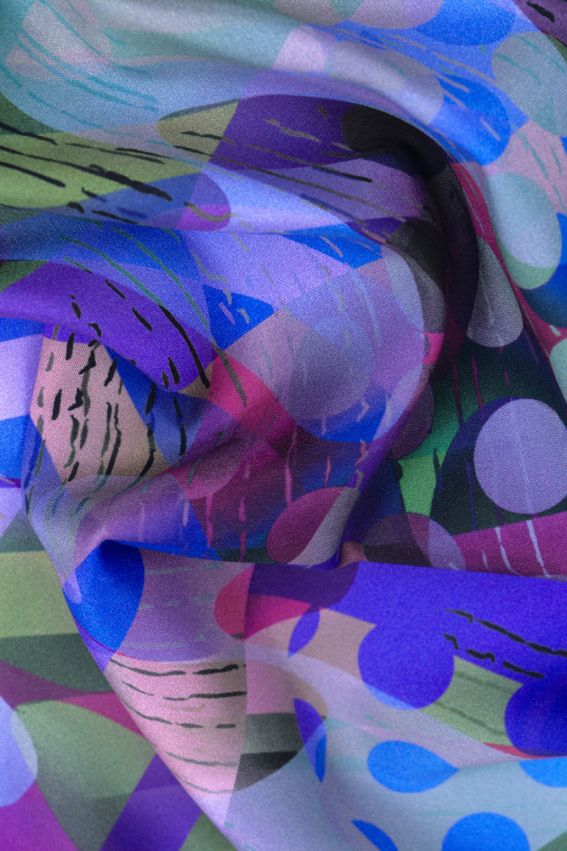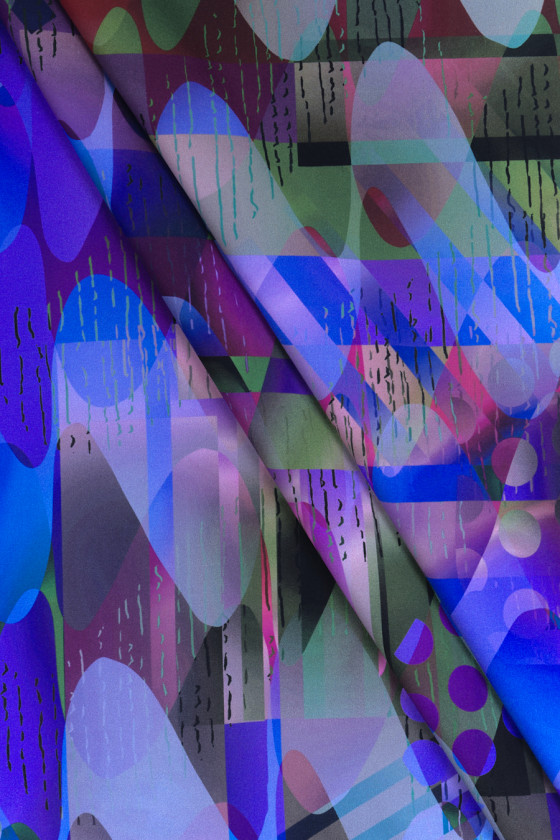 Itališkas šilko satinas, elastingas su "beprotišku" geometriniu motyvu. Nepastebimas įvairių modelių derinys, be kita ko. taškai, įstrižos juostelės ir bangos sukuria labai įdomią "netvarką". Visa tai laikoma juoda, rugiagėlė, violetinė ir žalia - atspaudas buvo padarytas matinėje pusėje. Fantastiškas pasiūlymas siūti įdomius marškinius ar suknelę.