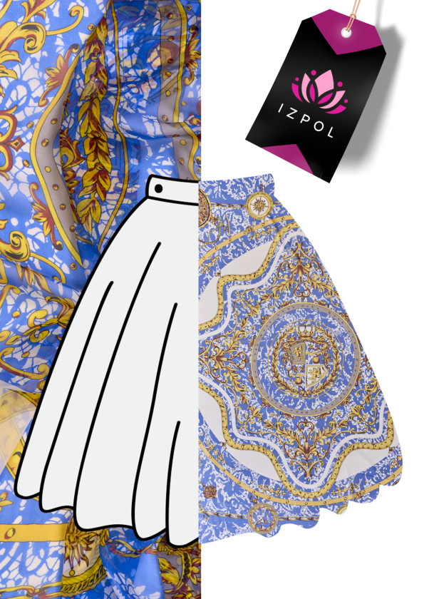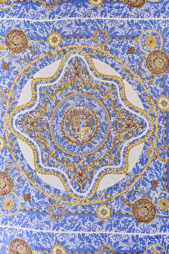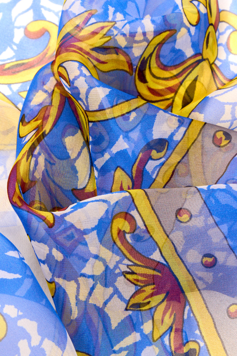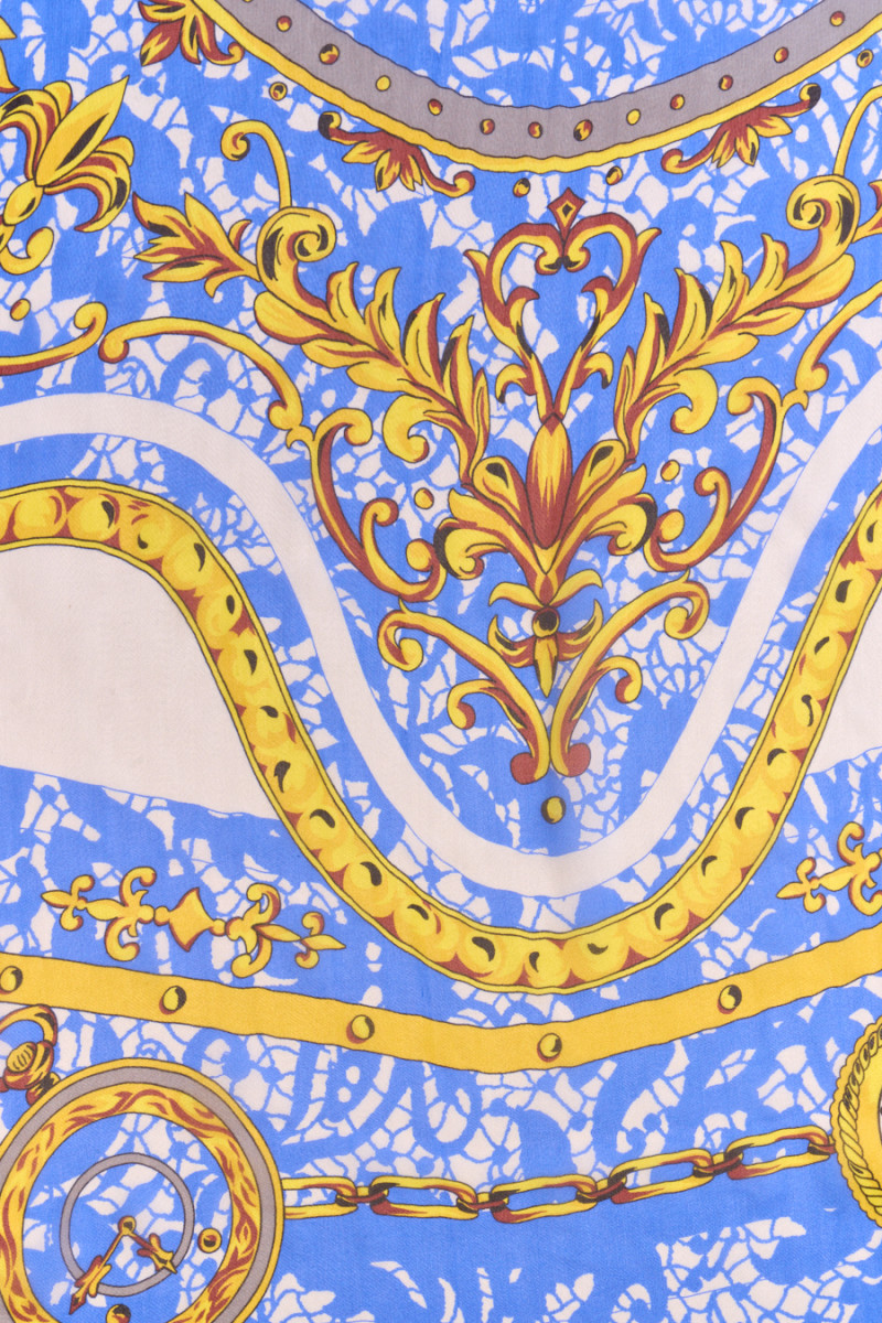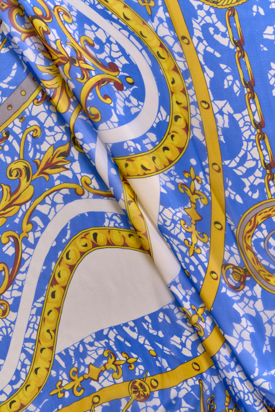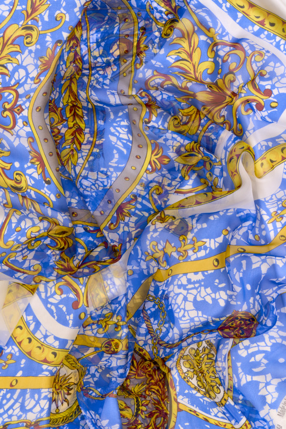 Itališkas muslinas 100% šilkas mėlynos ir kreminės spalvos su gelsvai rudais ornamentais ir grandinėlėmis. Kupono centrą puošia herbas su liūtais ir karūna, šonai su kišeninių laikrodžių raštais. Audinys pateikiamas kuponais, kurių matmenys yra 130cm * 135cm. Natūralus šilko muslinas yra labai subtilus, erdvus, skaidrus audinys su subtiliu blizgesiu, būdingu šilko audiniams. Puikiai tinka prie lengvų suknelių, palaidinių, sijonų ar šalikų.