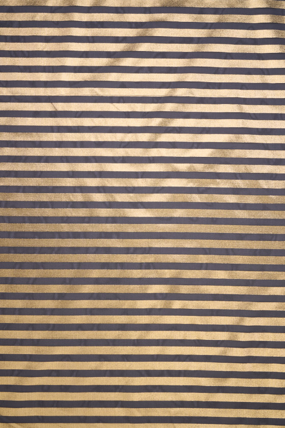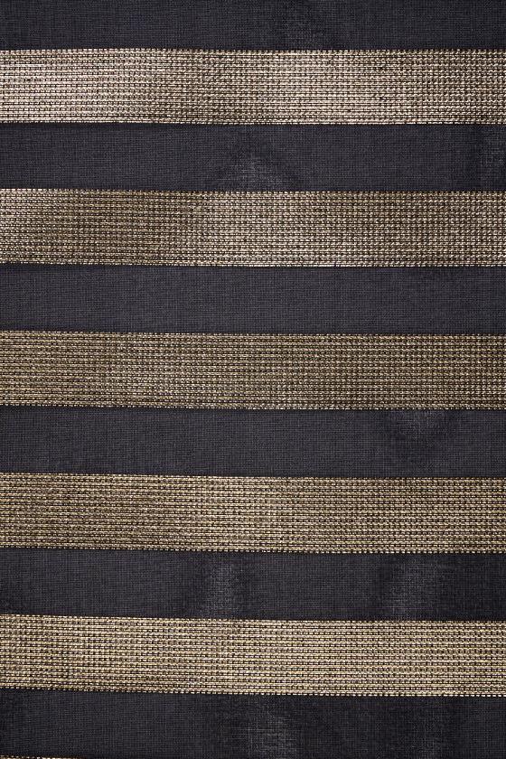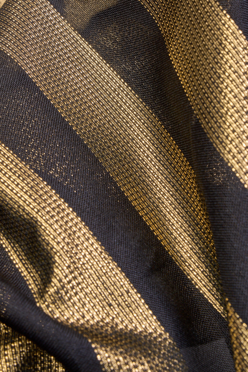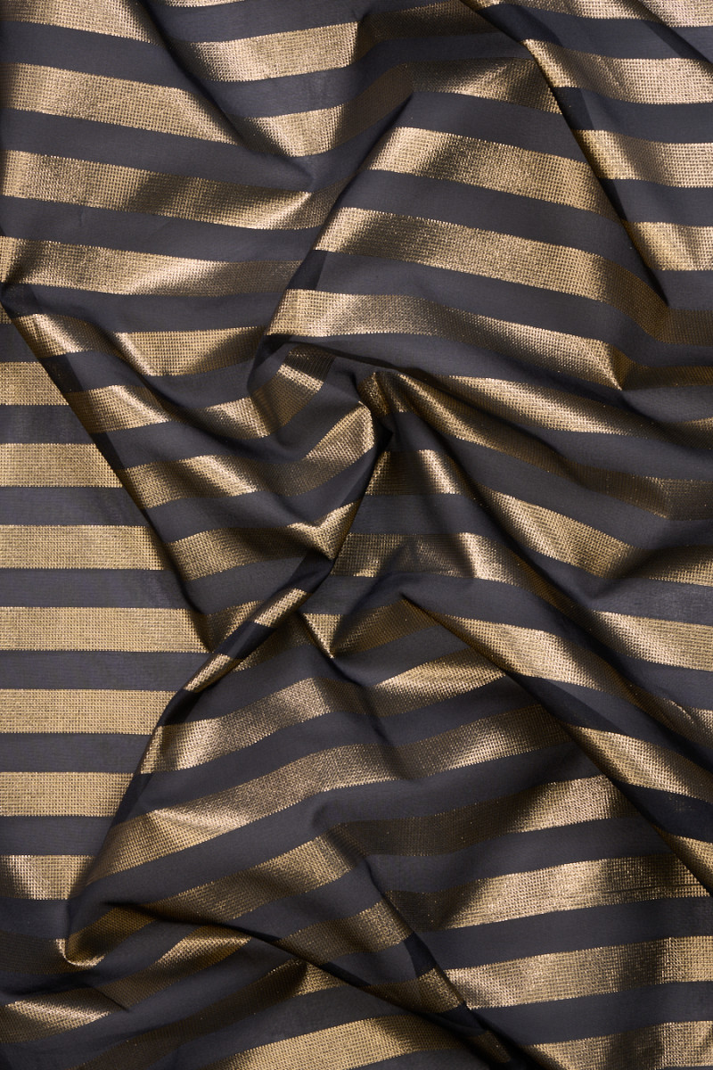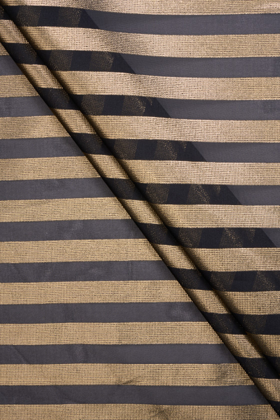 Itališkas organzos audinys juodos spalvos su taisyklingomis aukso juostelėmis, 2 cm pločio, kartojamas kas 2 cm. Audinys yra standus, skaidrus, neelastingas ir plonas. Išskirtinis pasiūlymas, puikiai tinkantis sukurti unikalų sijoną ar suknelę.