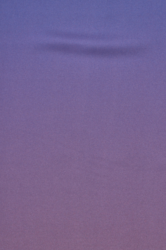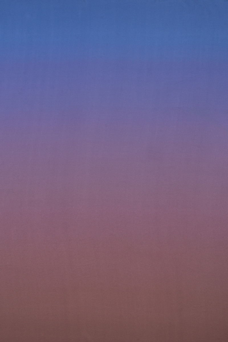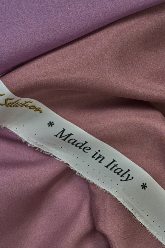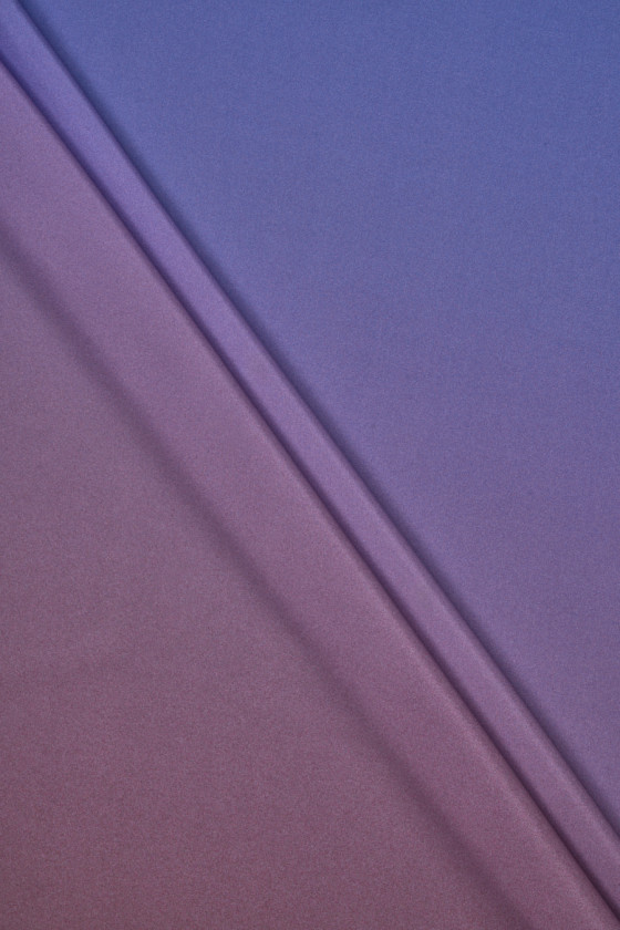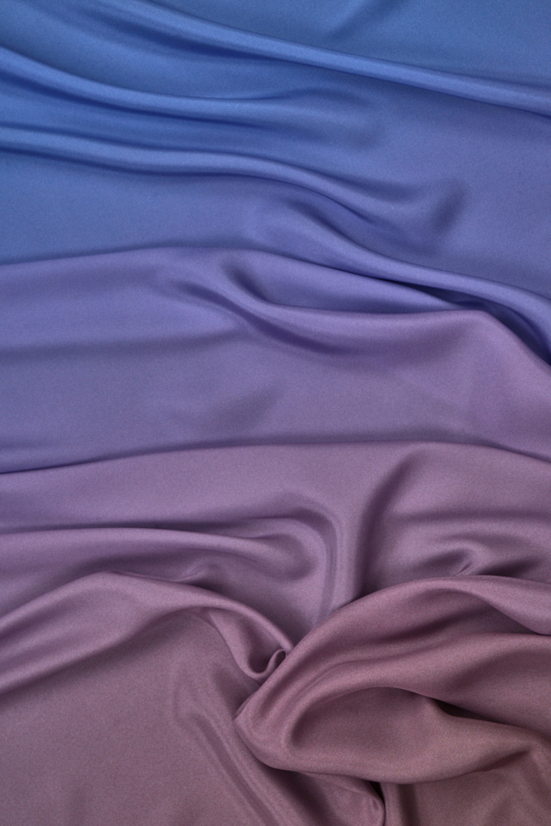 Itališkas 100% šilko satinas su ombre efektu mėlynai rožinis. Matinėje pusėje atspausdintas raštas viename krašte pereina nuo mėlynos spalvos, nuo violetinės iki purvinos rožinės spalvos kitame audinio krašte - rekomenduojame siūti perimetriškai. Audinys teka, minkštas, labai malonus liesti ir neelastingas. Gražus pastelinių spalvų pasiūlymas suknelėms, sijonams ir marškiniams.