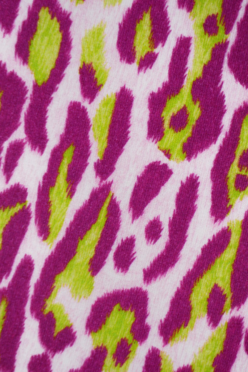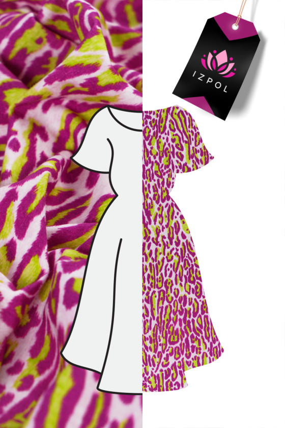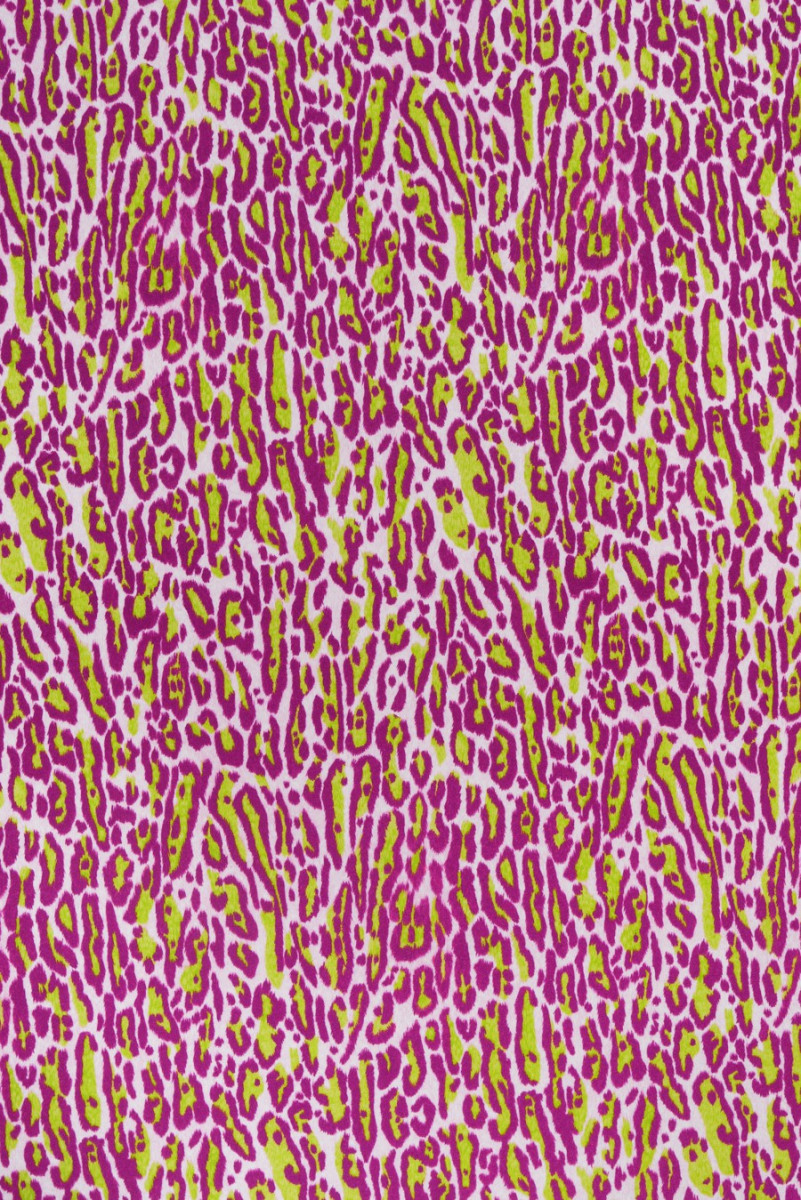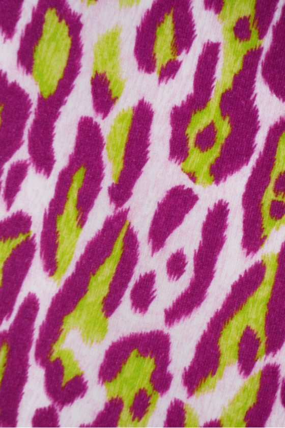 Itališkas, elastingas medvilninis megztas audinys su leopardo atspaudu madingiausiomis spalvomis šį sezoną - fuksija ir aštri žalia ecru fone.