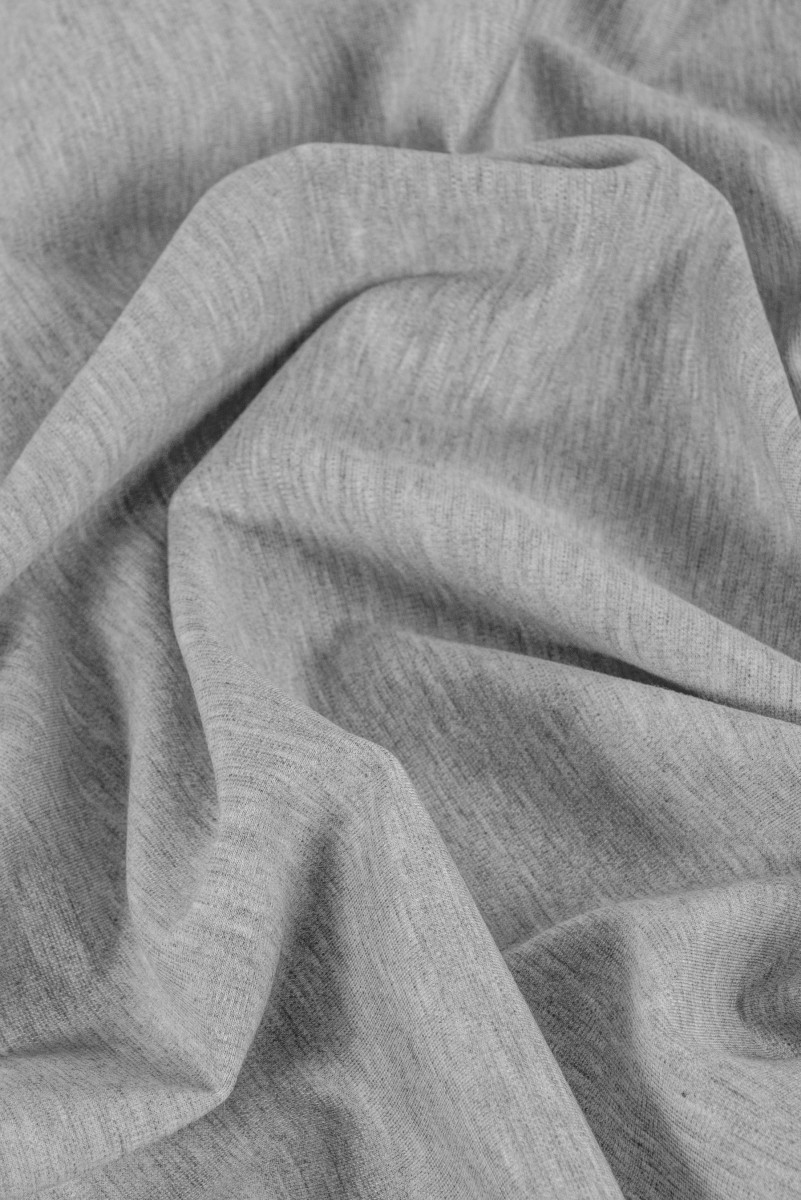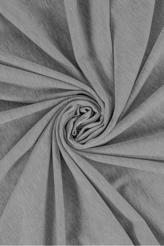 Itališkas viskozės trikotažinis megztas audinys šviesiai pilkos spalvos - melange. Džersio audinys yra dengiamasis, švelniai aptraukiantis megztas audinys, kurį galima siūti be pamušalo.